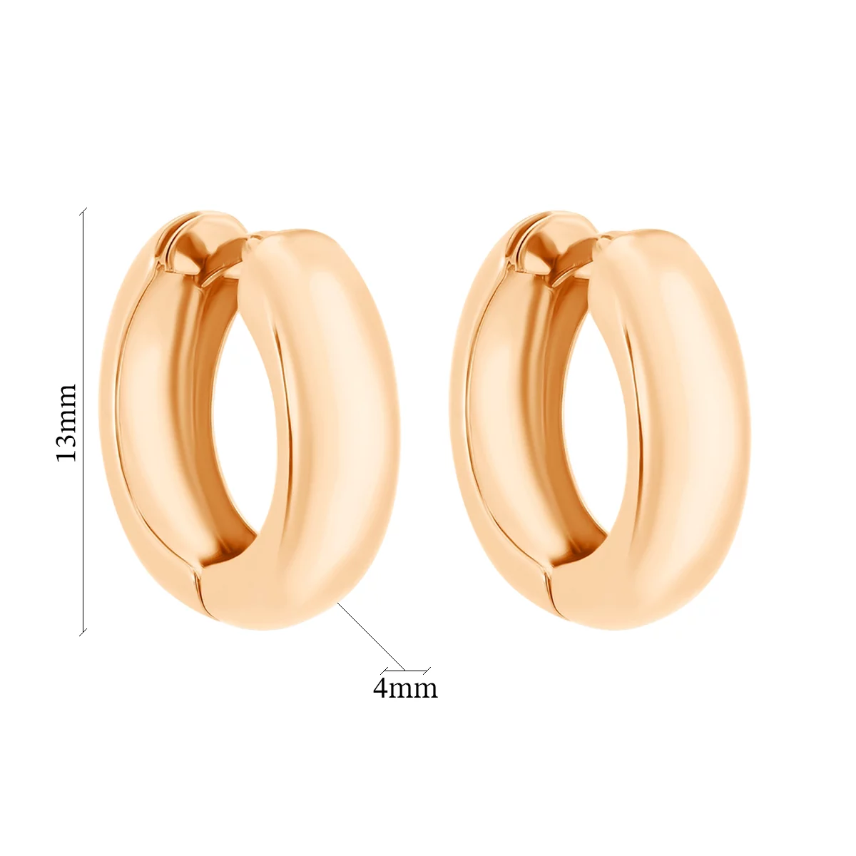 Золотые серьги-кольца привлекают стильным внешним видом. Ювелирное украшение изготовлено из красного золота 585-ой пробы. Благодаря наличию меди в составе сплава изделие отличается приятным оттенком и меньше поддается повреждениям. Такая лигатура обеспечивает прочность и износостойкость украшения. Серьги крепятся с помощью застежки-булавки. Она простая, надежная и удобная. Лаконичный и оригинальный дизайн золотых сережек украсит ваш торжественный образ или станет незаменимым для повседневного.