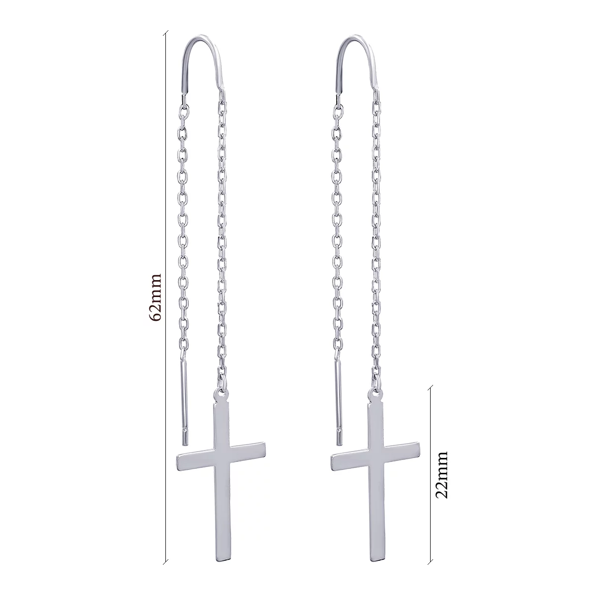 Модные серьги-протяжки fashion-стиля понравятся современным девушкам и женщинам. Сделаны из серебра, проба 925 подтверждает их высокое качество и прочность. Благородный холодный белый оттенок ювелирного украшения обусловлен составом сплава. Конструкция сережки состоит из цепочки, к которой крепится крестик. Изделие не застегивается, для удобства его край оснащен палочкой-иглой. Такое украшение подходит всем девушкам. Оно станет завершающим элементом повседневного, стильного или торжественного образа. Это достойный подарок девушке.