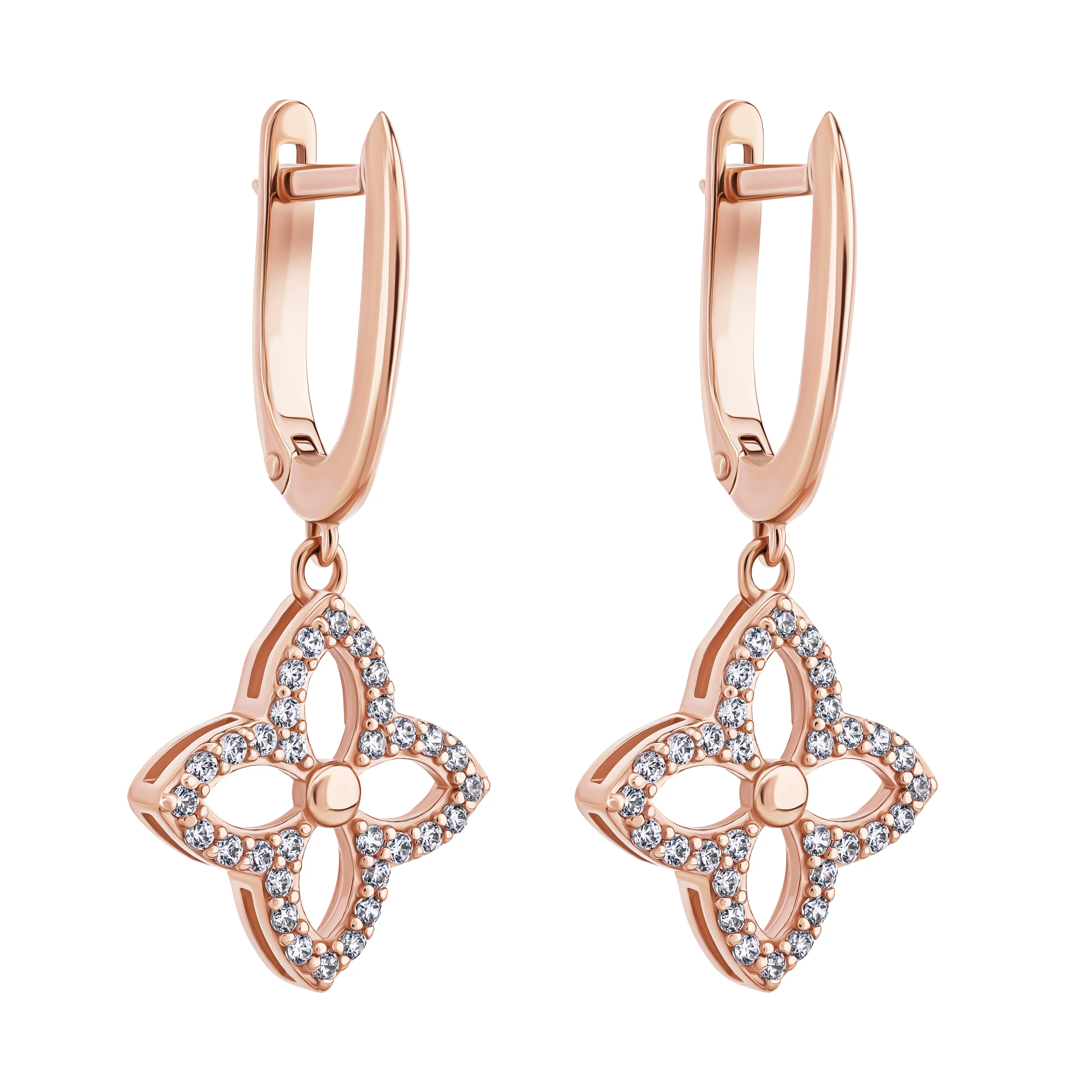 Сережки из красного золота с подвесами с фианитами и жемчужиной - 1690617