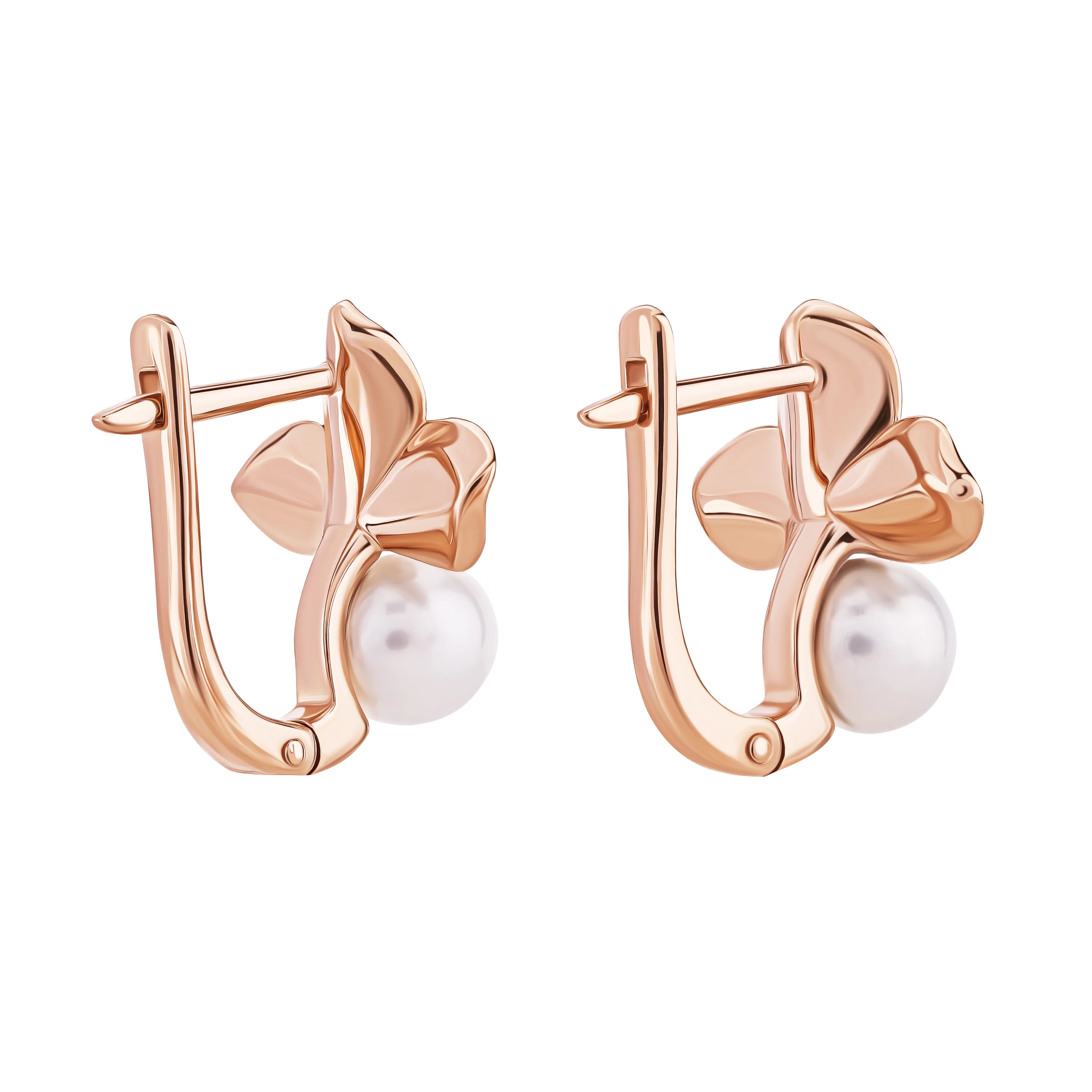 Сережки в форме листочка из красного золота с жемчужиной и фианитами - 1630904