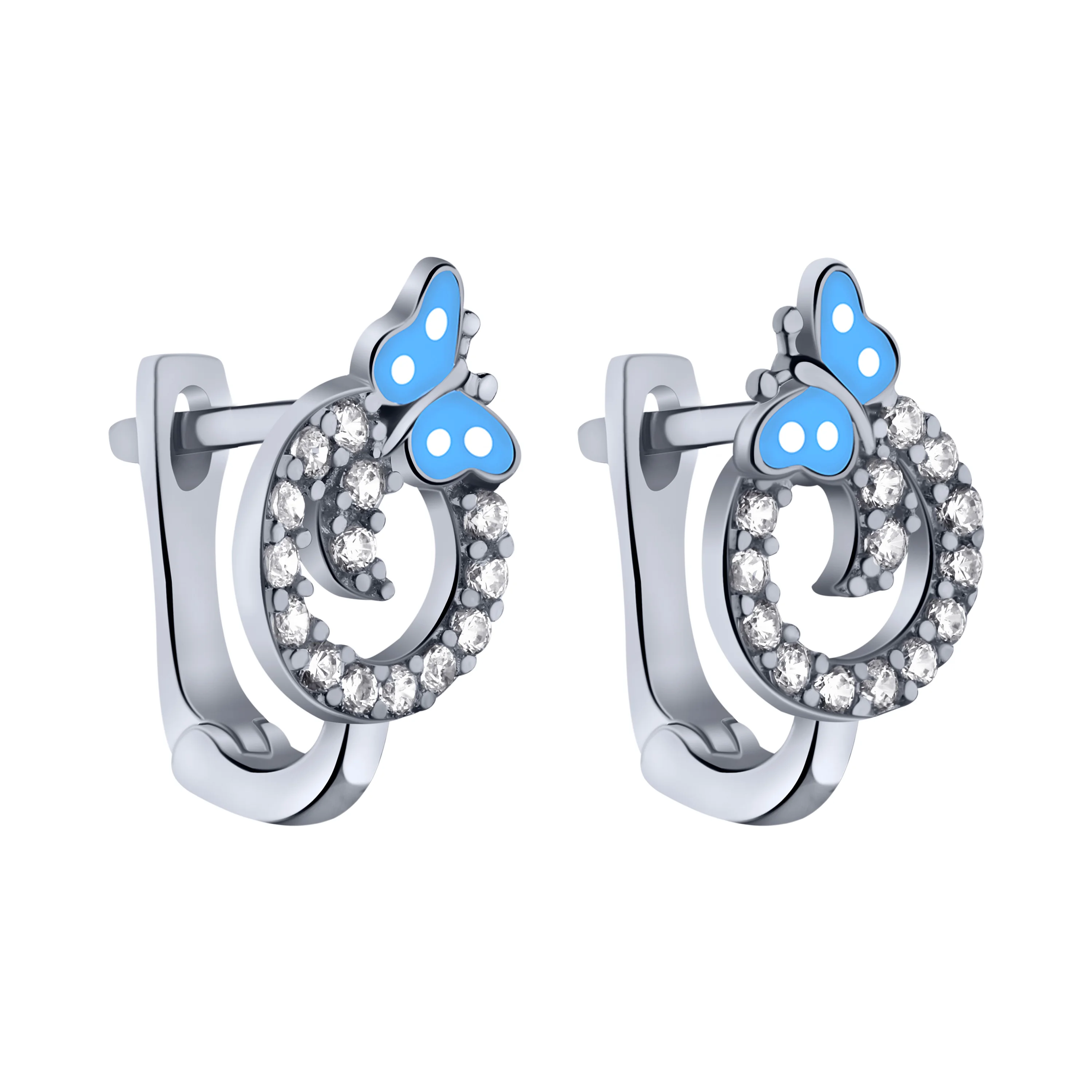 Серьги детские серебряные "Мотылек" с россыпью фианитов и эмалью - 2024655