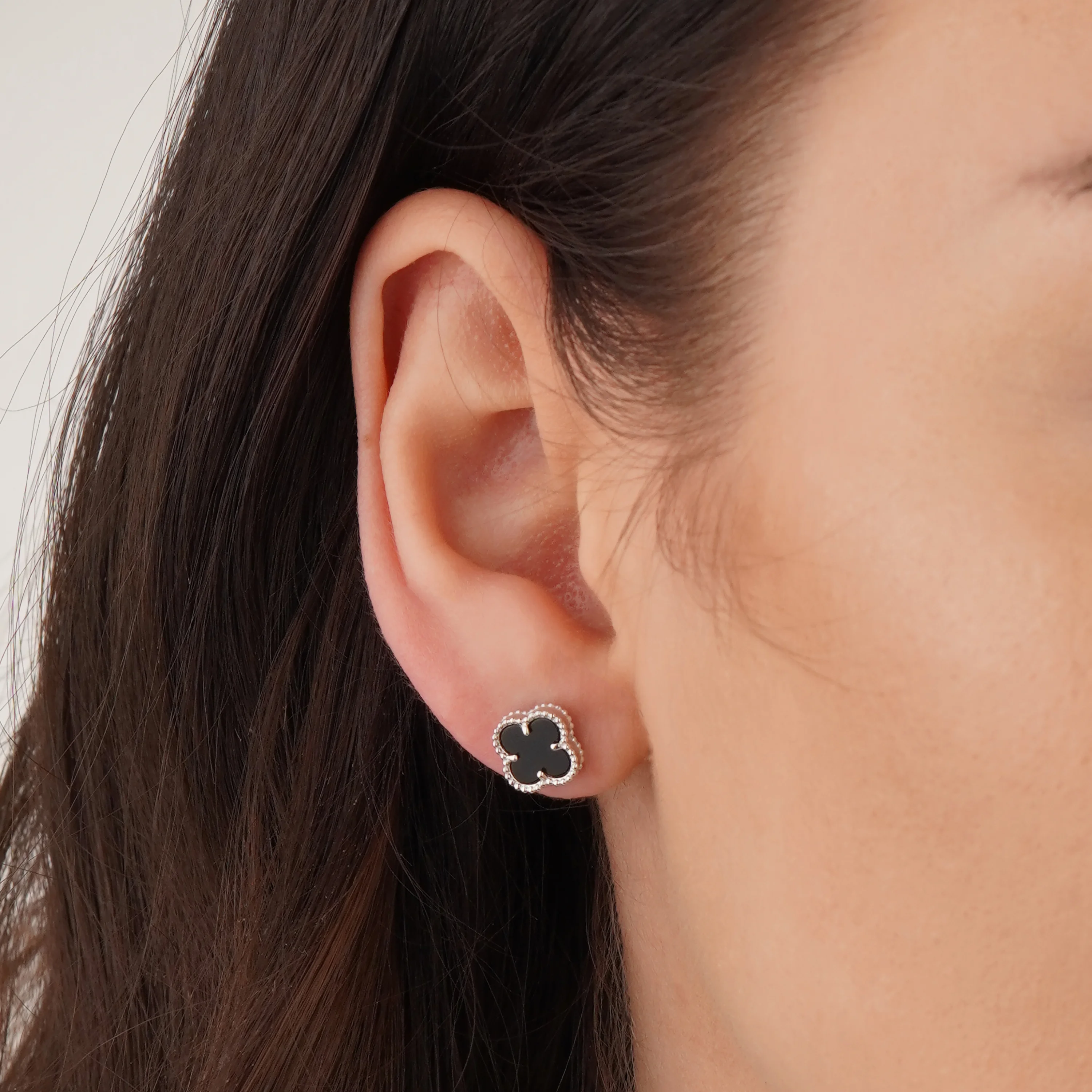 Стильные сережки-гвоздики "Клевер" из красного золота с ониксом - 1878296