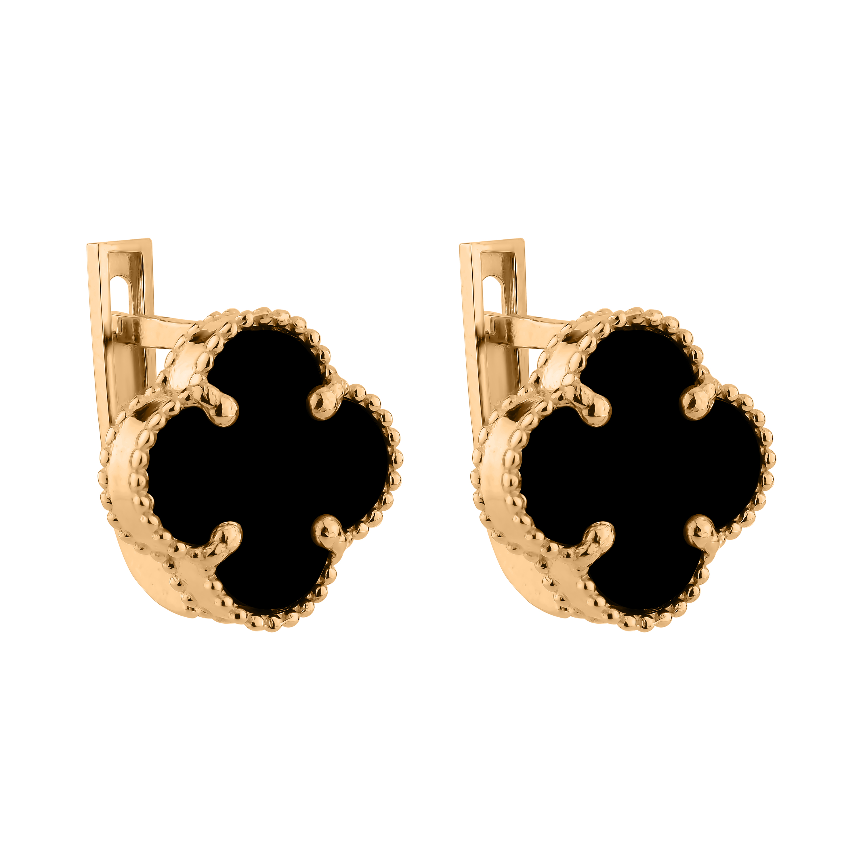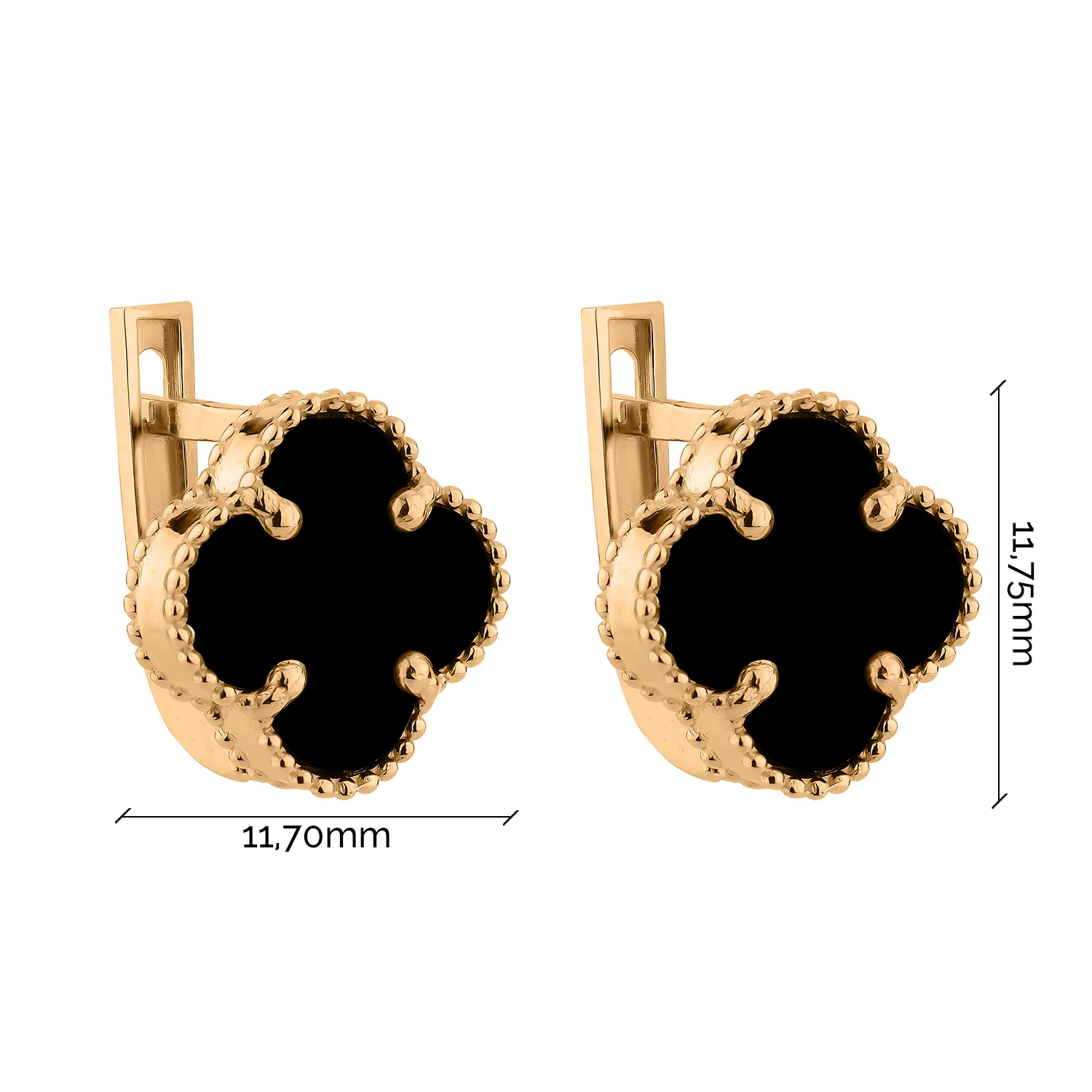 Стильные сережки-гвоздики "Клевер" из красного золота с ониксом - 1878296
