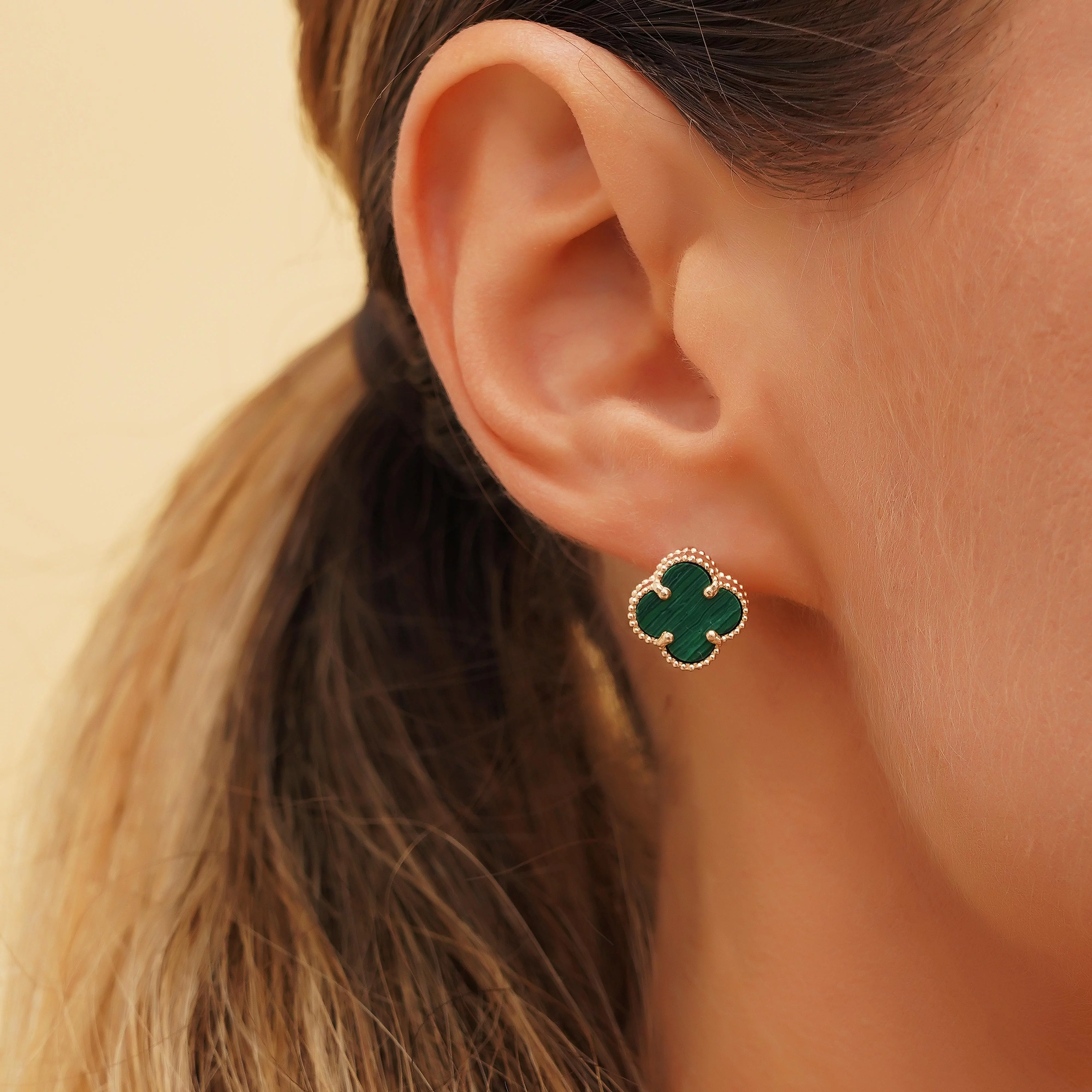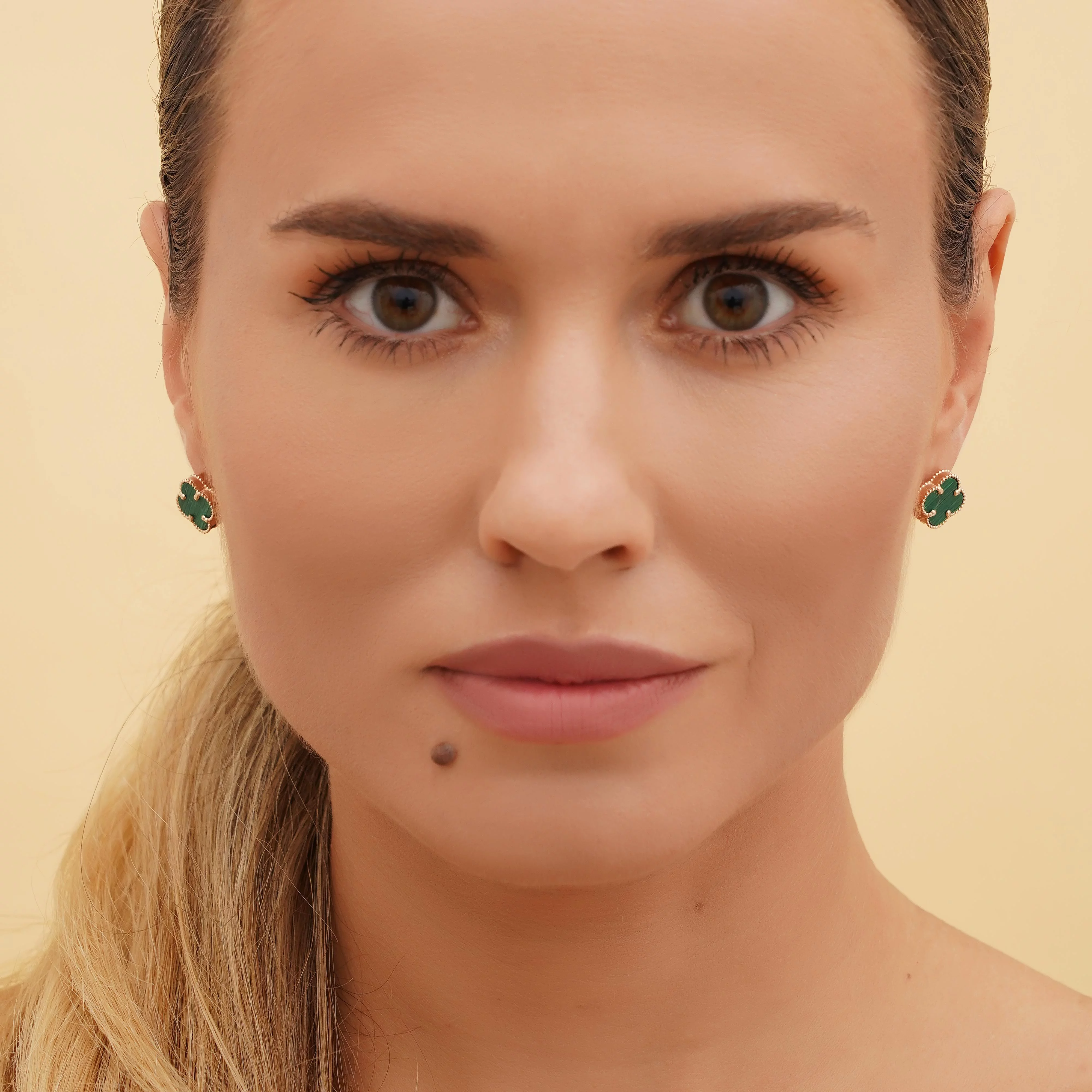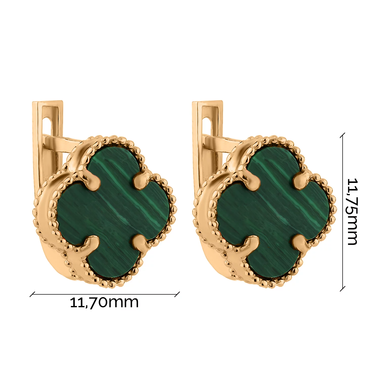 Стильные сережки-протяжки "Клевер" из желтого золота с ониксом - 1872762