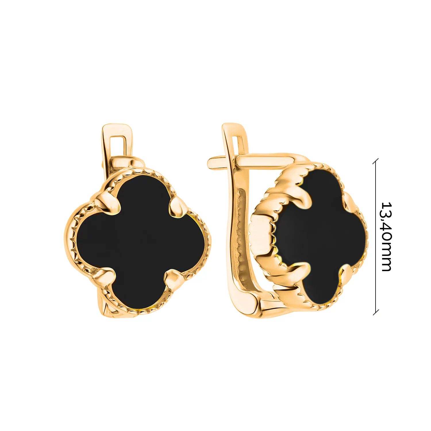 Стильные сережки-протяжки "Клевер" из желтого золота с ониксом - 1872762