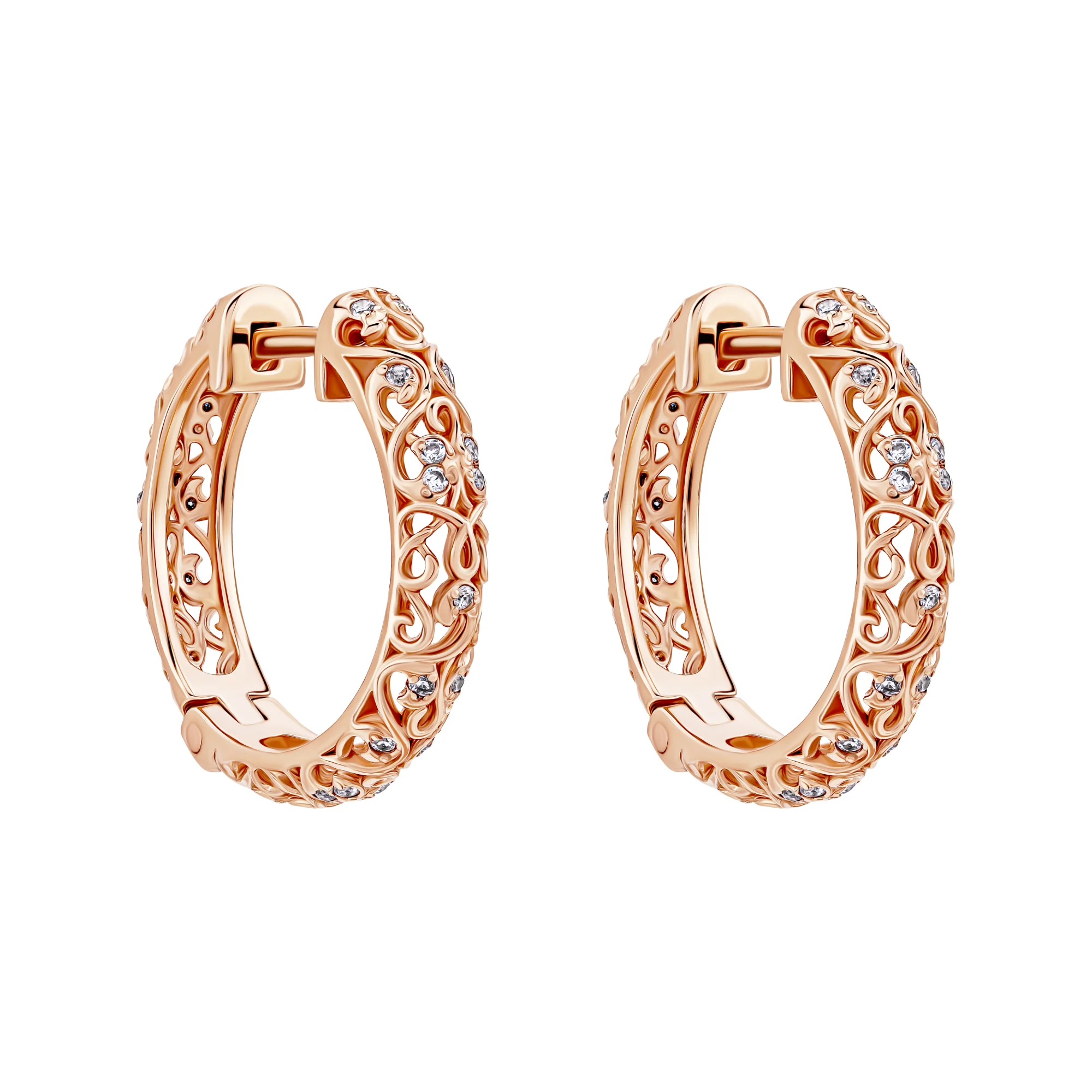 Оригинальные золотые серьги-кольца типа конго. Представлены в фантазийном ажурном дизайне. Fashion концепция изделия выстроена от А до Я: здесь превалирует функционализм в сочетании с модными тенденциями современности. Швенза искусно переплетена в узорчатых орнаментах, где один за другим спрятаны блестящие фианиты.¶Серьги-кольца из красного золота – это поистине универсальное решение для любого пиршества, праздничной даты, обыденной жизни. Драгоценность привнесет в женский look завершенность и красоту. Комбинируйте аксессуары, играйте с цветами и тональностями, экспериментируйте с нарядами – серьги будут кстати всегда и везде!