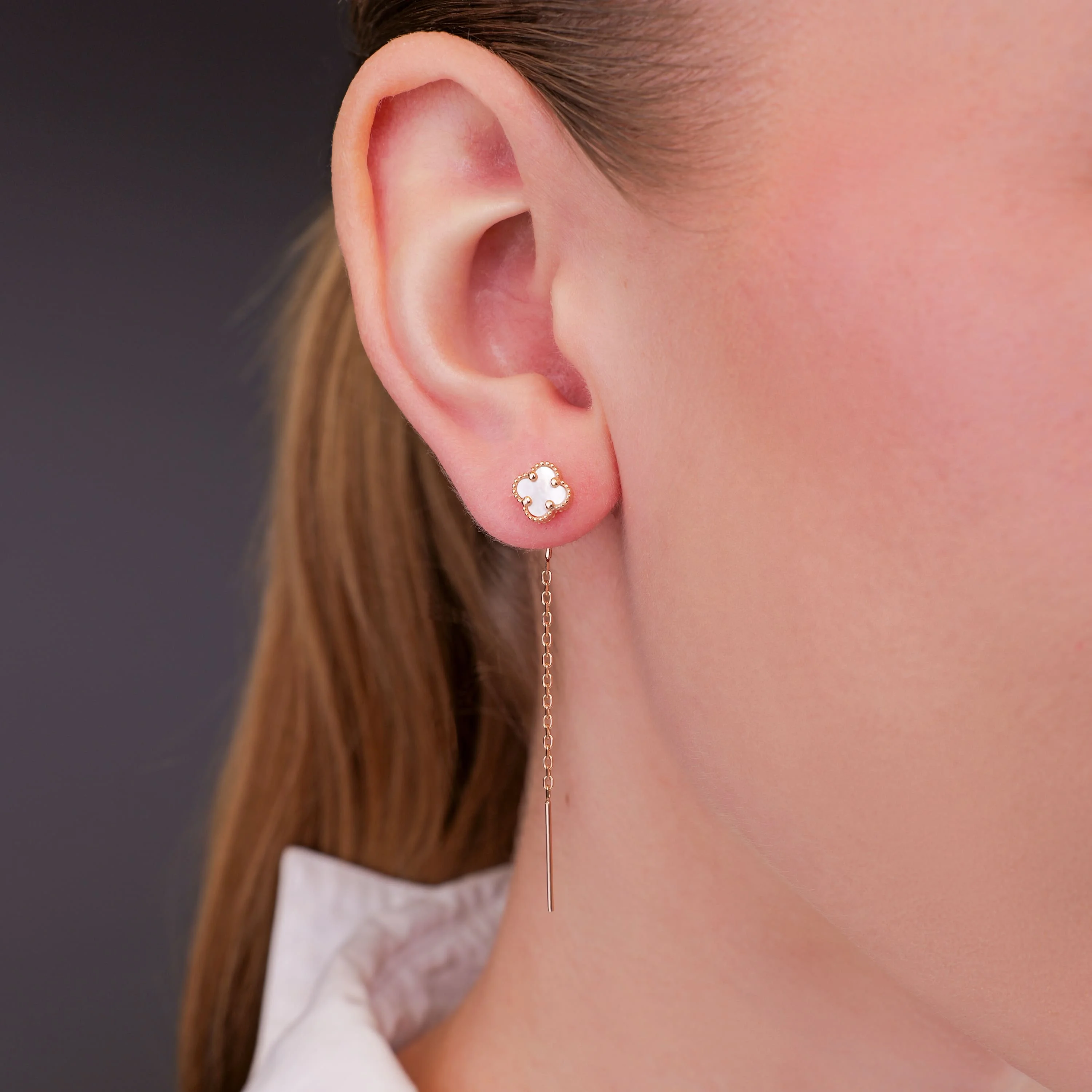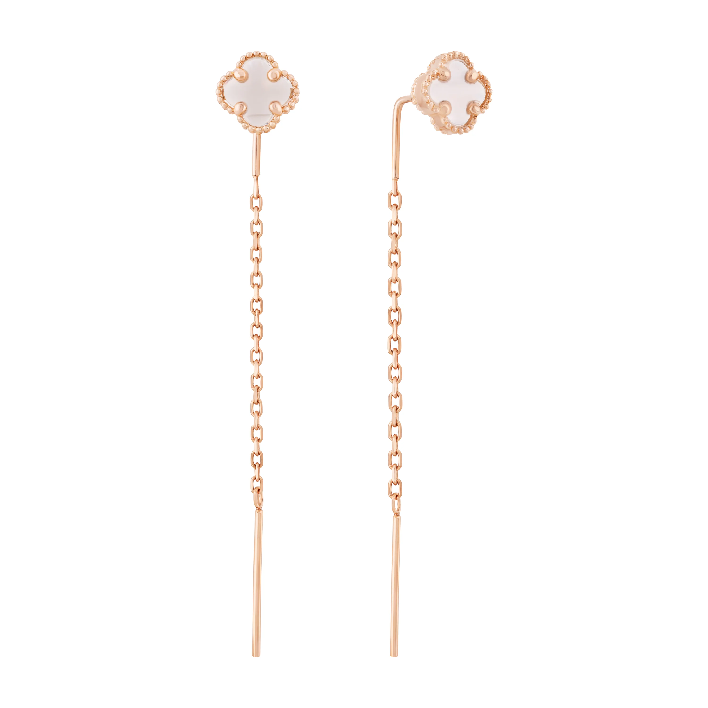 Изящные серьги-протяжки «Клевер» с перламутром в красном золоте — украшение, которое станет дополнением к повседневному и вечернему образам. Основание изготовлено в форме четырехлистника, символизирующего счастье и удачу. Клевер украшен перламутровой вставкой, придающей сережкам изысканность. Изготовлены они из золота 585 пробы с добавлением 9,5% меди в лигатуру сплава, что придает драгметаллу красный оттенок. В ушах сережки закрепляются благодаря цепочке-протяжке с палочкой-иглой. Такие украшения станут приятным подарком себе или кому-то.