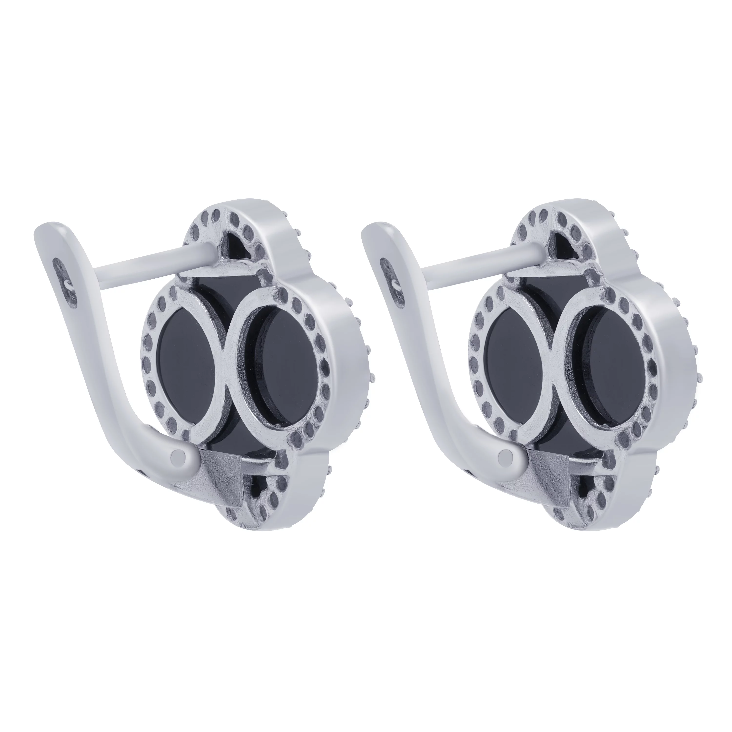 Серебряные стильные сережки-пусеты "Клевер" с ониксом и фианитами - 1940309