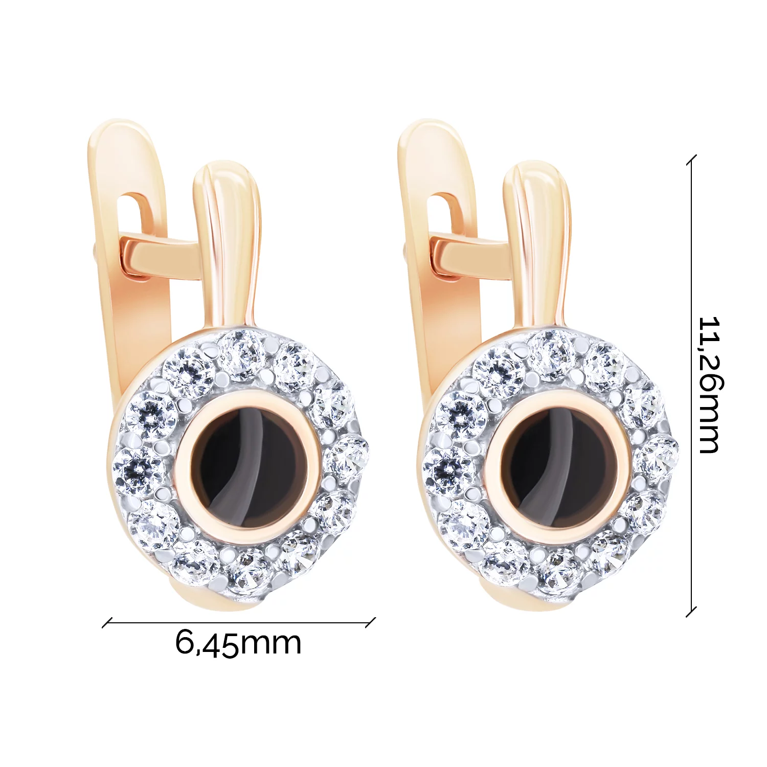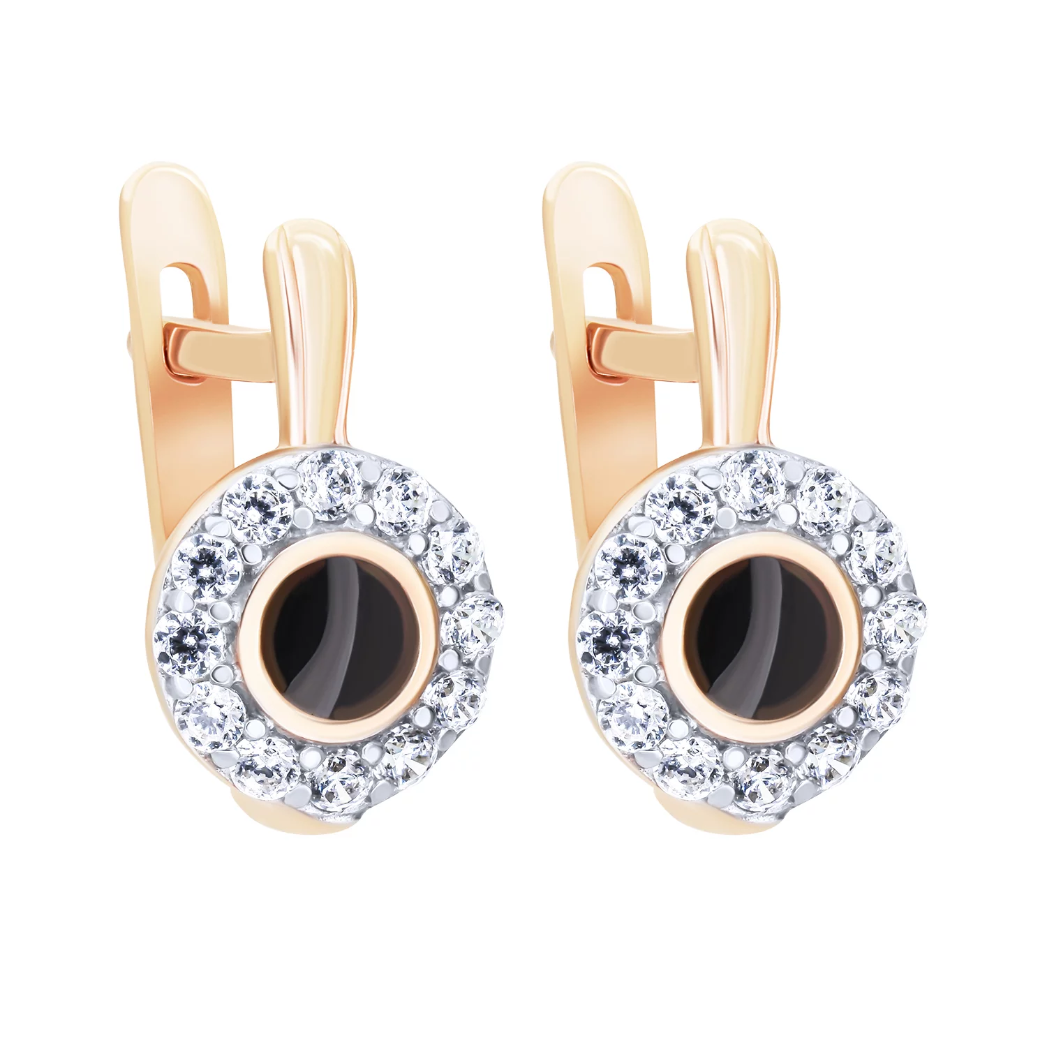 Стильные сережки "Круг" в красном золоте с эмалью и фианитами - 1958507
