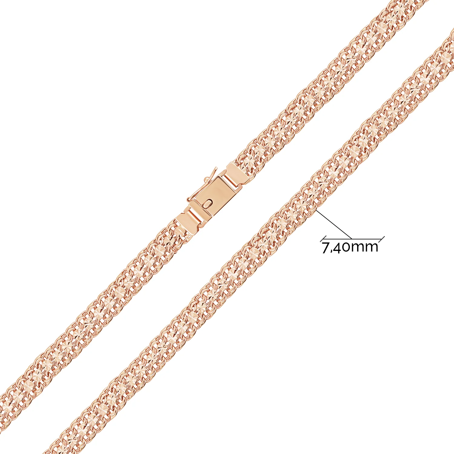 Широкий браслет в плетении двойной бисмарк — объемное украшение на руку, которое будет заметным благодаря дизайну. Состоит оно из двух цепочек, расположенных рядом и объединяющих круглые звенья, переплетающиеся между собой. Изготовлен браслет из красного золота 585-й пробы. Насыщенный цвет драгоценному металлу придает медь, добавленная в количестве 9,5% в состав лигатуры сплава. Широкий замок-коробочка гармонично дополняет изделие, помогая закрепить его на руке. Сочетать такой браслет можно как с деловыми, так и с повседневными нарядами.
