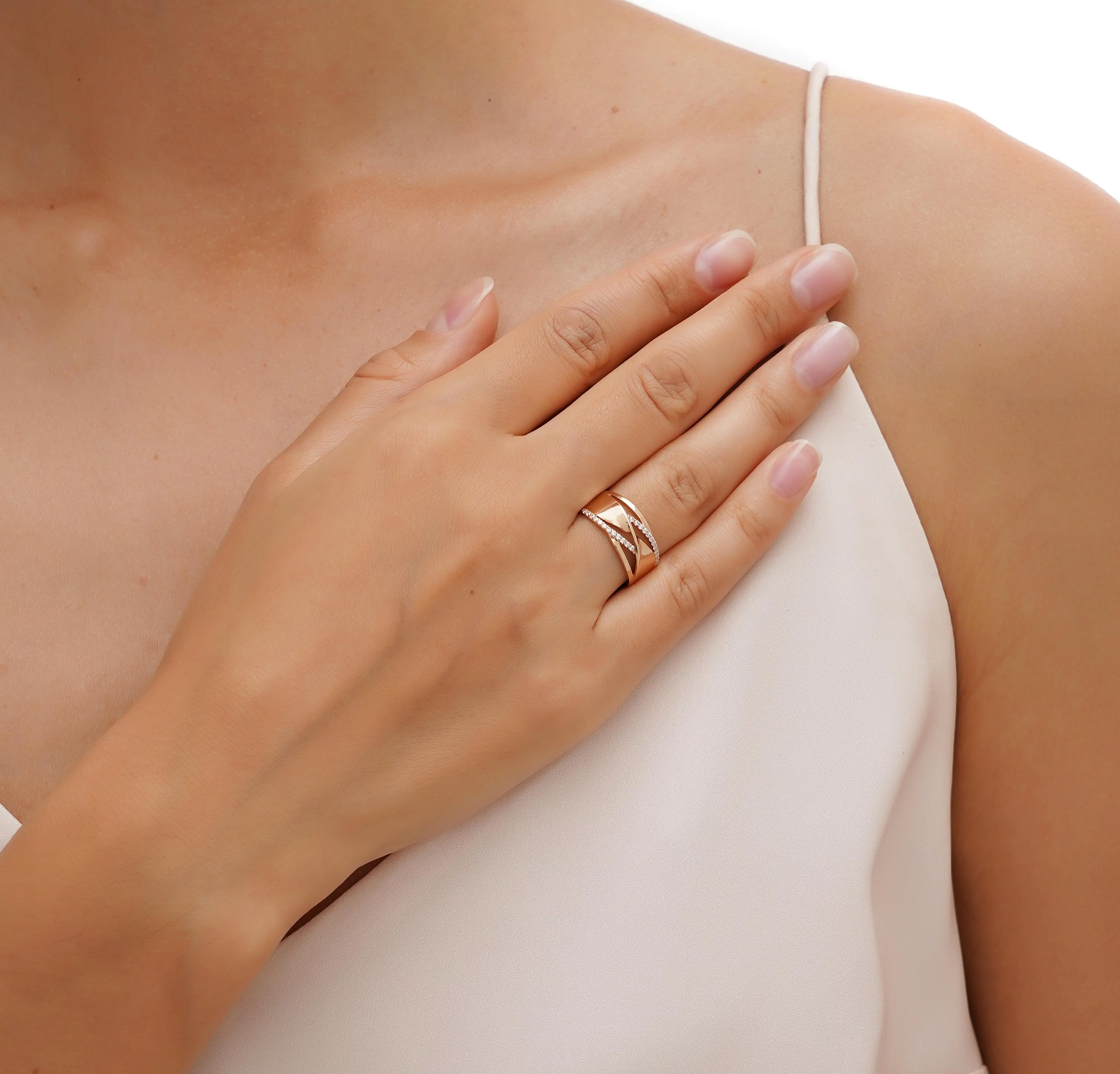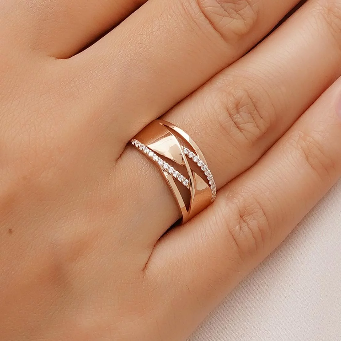 Стильное, изящное, широкое кольцо. Для его изготовления использовалось красное золото 585 пробы. Насыщенный оттенок металлу придает введенная в сплав медь. Основная часть обода выполнена в виде переплетения нескольких полос разной толщины. По центру — широкая, перекрученная в бант. По бокам — по две узких. Те, что ближе к середине, украшены дорожками из фианитов. На каждой по 12 камней. Они закреплены в материале корнеровым способом. Каждый самоцвет обработан классическим круглым способом для идеальной игры в лучах света.