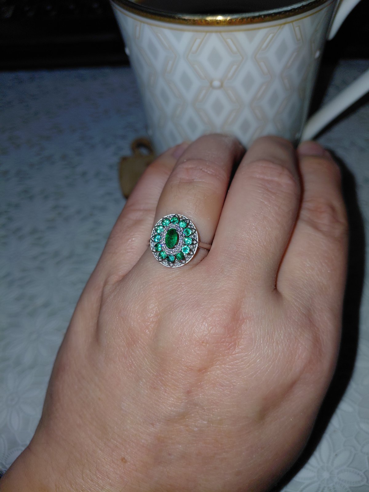 Стильное кольцо из белого золота с изумрудами и бриллиантами - 1861187