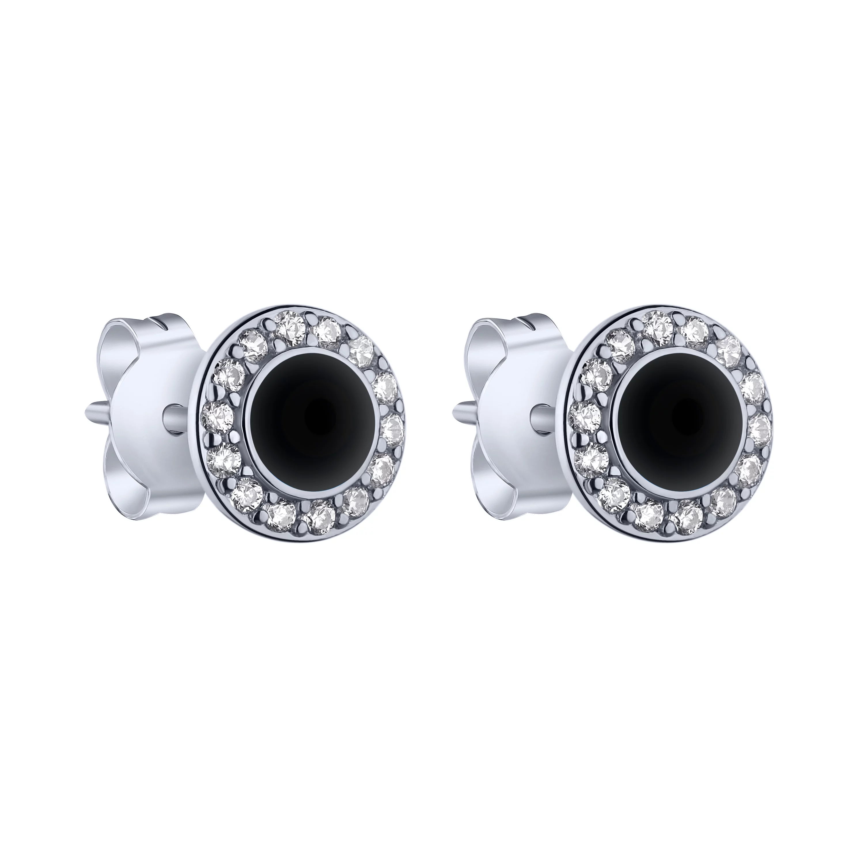 Стильные сережки-пусеты "Круг" в красном золоте с эмалью и фианитами - 1958570