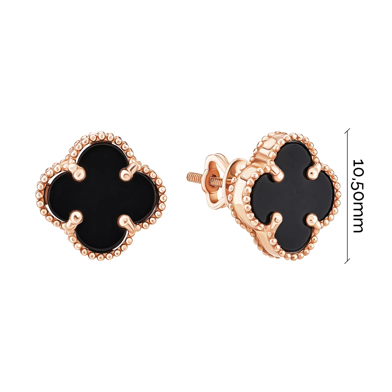 Стильные сережки-протяжки "Клевер" из желтого золота с ониксом - 1872762