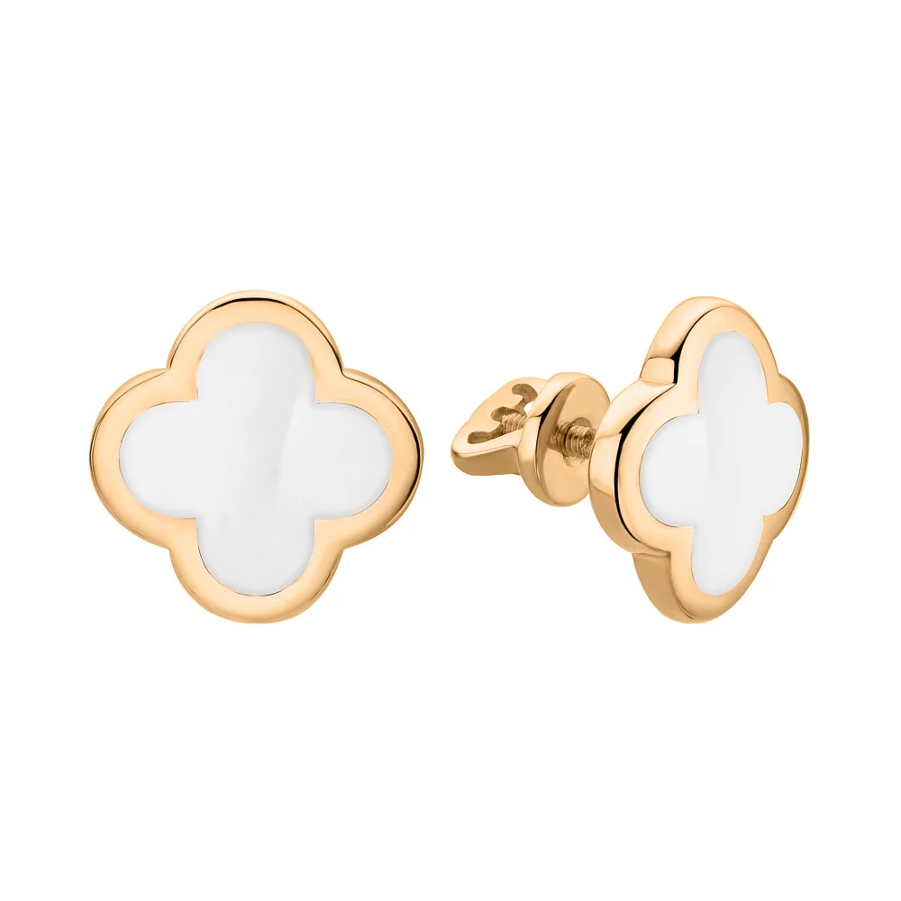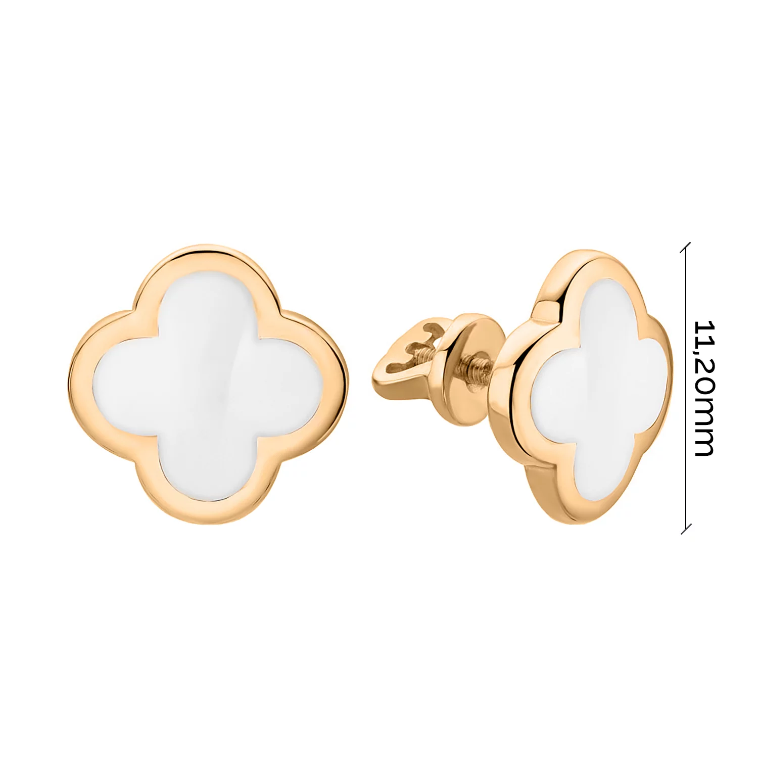 Стильные сережки-гвоздики "Клевер" из красного золота с ониксом - 1878296