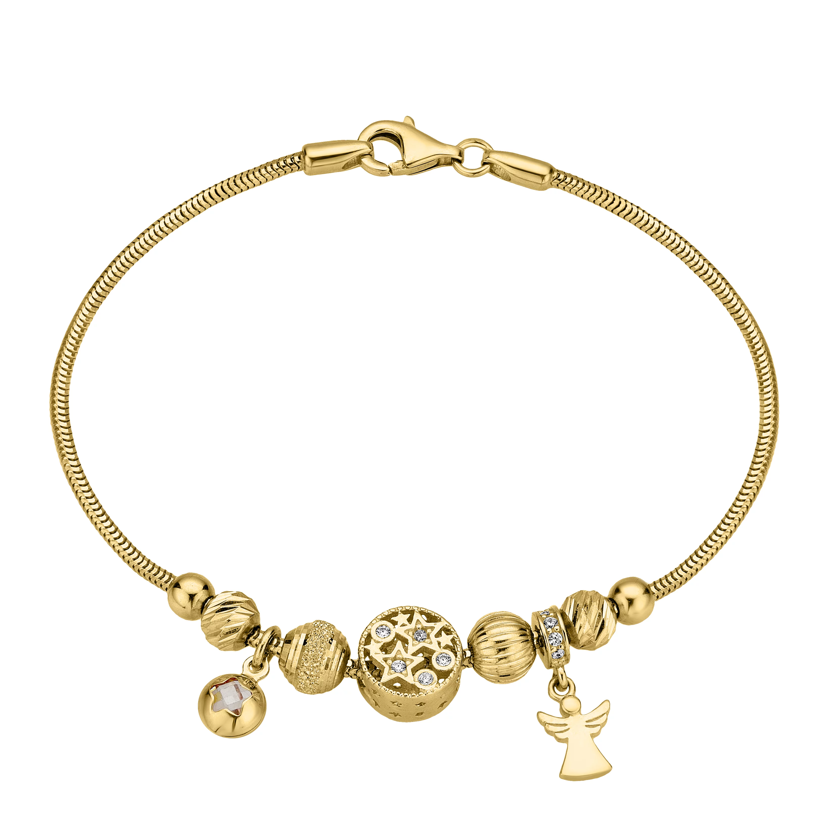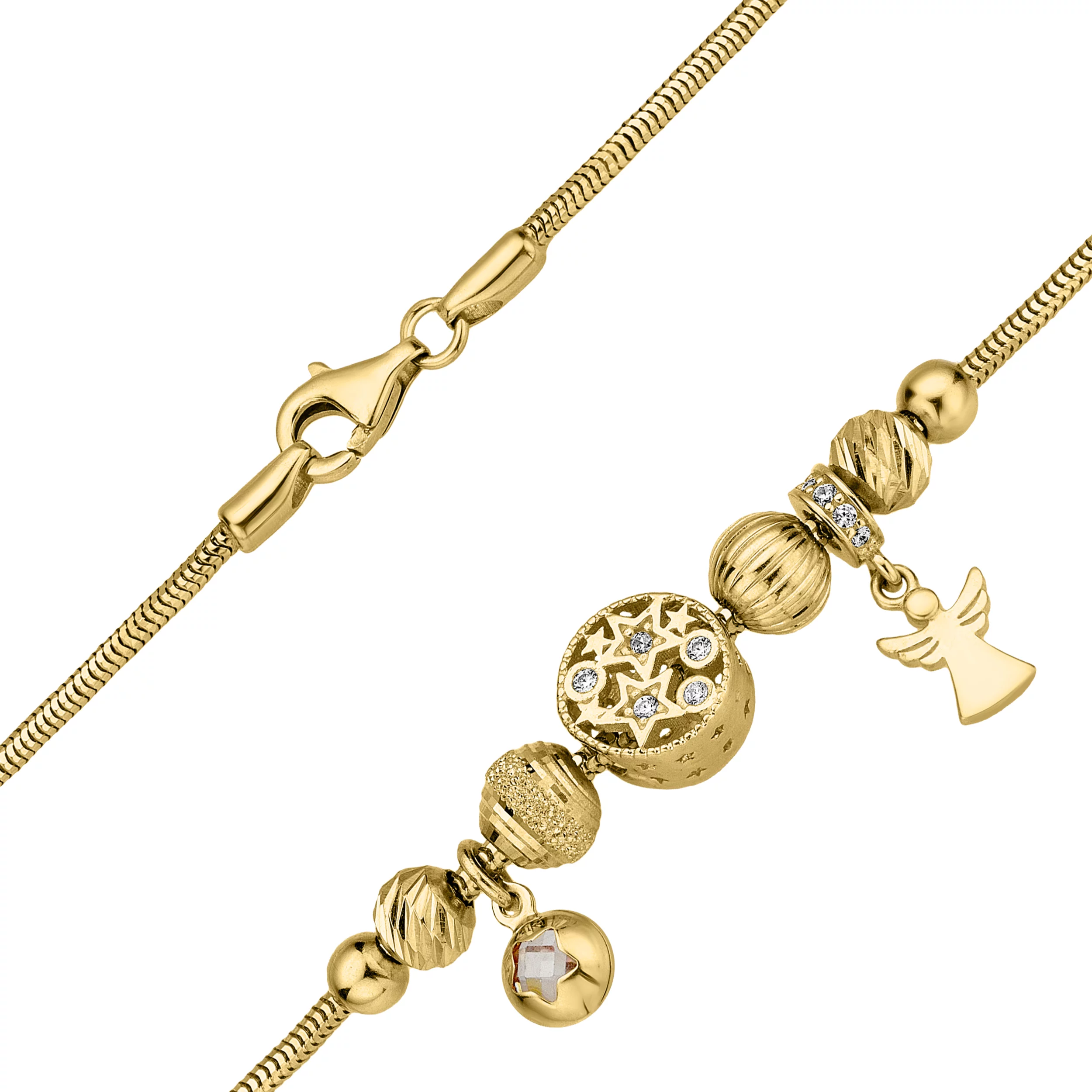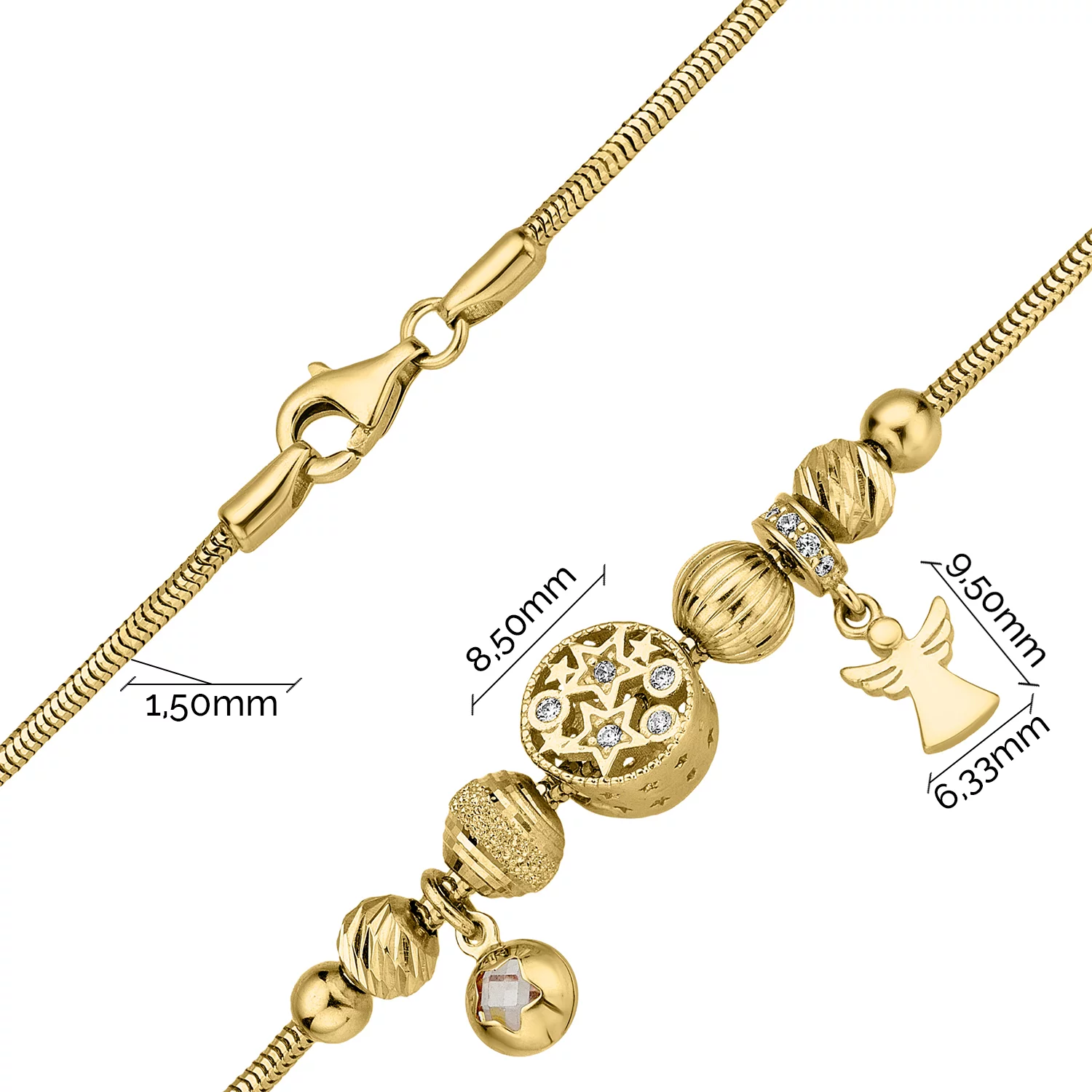 Браслет "Шары" из желтого золота с подвесами с фианитами и плетением снейк - 1856538