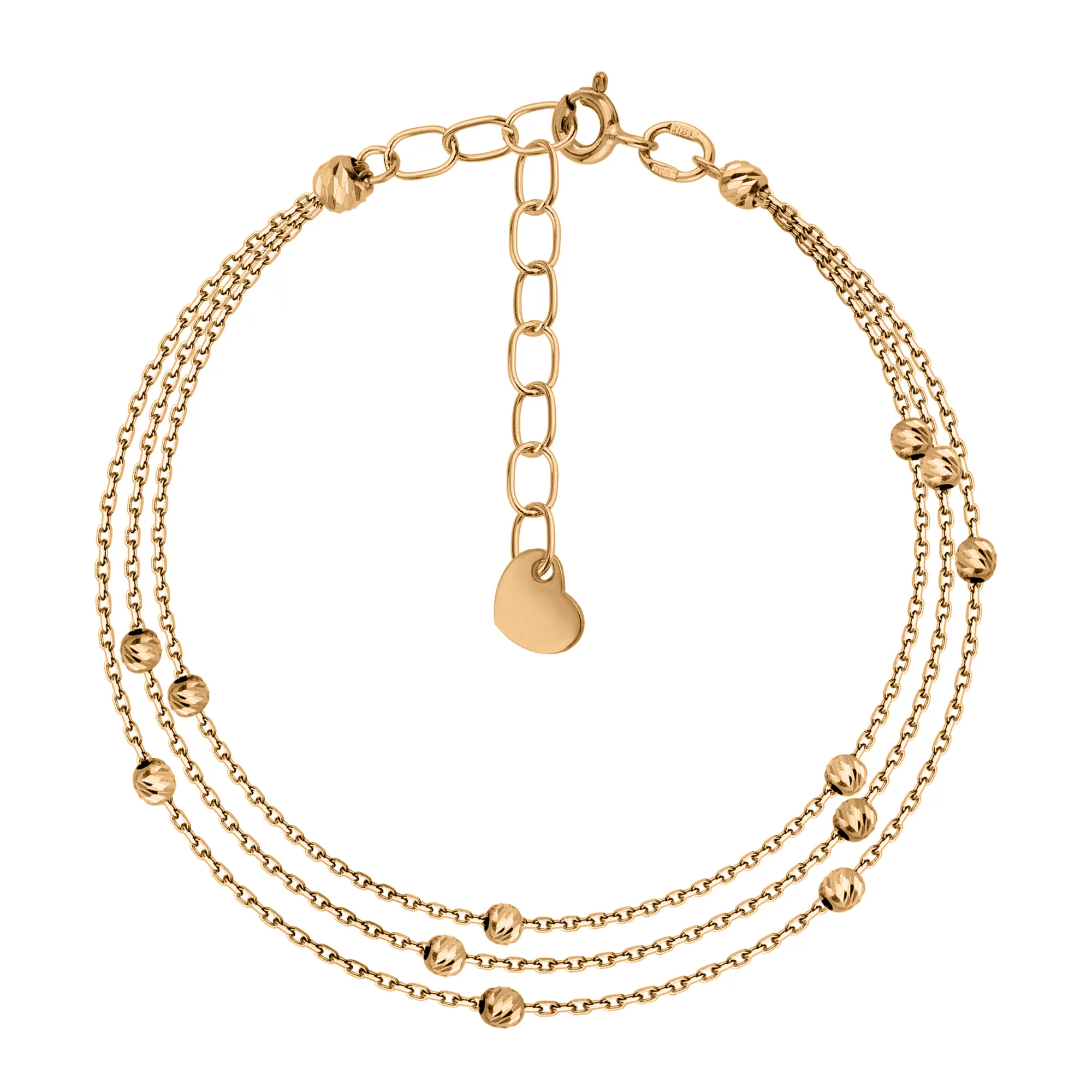 Мягкий тройной браслет из красного золота «Шарики» в плетении якорь — изысканное и утонченное украшение на женскую руку. Изделие состоит из трех тонких цепочек разной длины, а закрепить его на запястье позволяет шпрингельный замок в виде кольца. Браслет украшен объемными шарами и плоским подвесом в форме сердца. Благодаря универсальному якорному плетению цепочки выглядят изящными и элегантными. Изготовлен браслет из золота 585 пробы, в лигатуру сплава которого добавлено 9,5% меди, что придает драгметаллу красный оттенок.