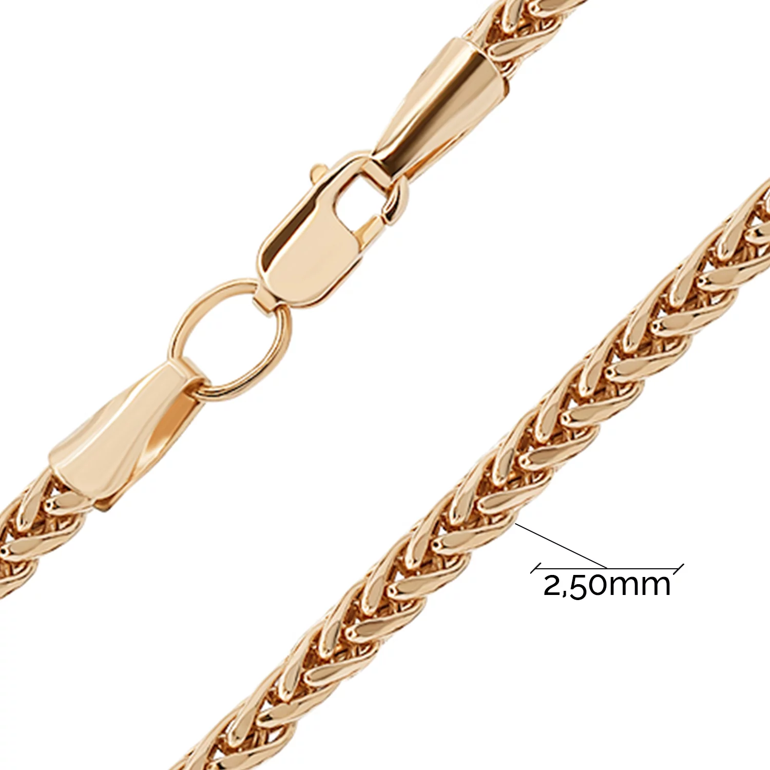 Цепочка в технике плетения колосок выполнена из красного золота 585 пробы. Ювелирное изделие с лаконичным дизайном в классическом стиле подходит мужчинам и женщинам. Изящный драгоценный металл с добавлением меди при освещении дает эффект червленого отблеска. Цепочка с четким соблюдением пропорций подходит к строгим деловым и повседневным костюмам. Такое украшение уместно надевать на прогулку или по торжественному случаю. Ювелирное изделие будет хорошим подарком на любую знаменательную дату (день рождения, годовщину, юбилей и другие).