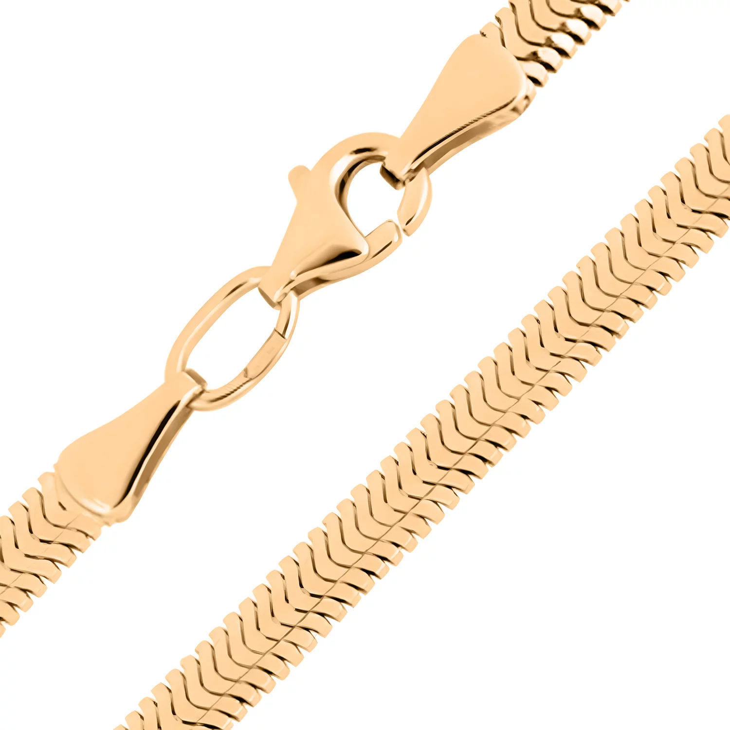 Цепочка из красного золота в плетении снейк — классический вариант украшения на шею, подходящего как женщинам, так и мужчинам. Соединить такое ювелирное изделие можно практически с любой подвеской, потому оно считается универсальным. Плетение снейк выделяется плотной вязкой, в которой все звенья достаточно тесно прилегают друг к другу. У такой цепочки поверхность гладкая и блестящая, будто кожа змеи, а при взгляде издалека заметен струящийся эффект, добавляющий изделию привлекательность. Выполнено украшение из золота 585 пробы.