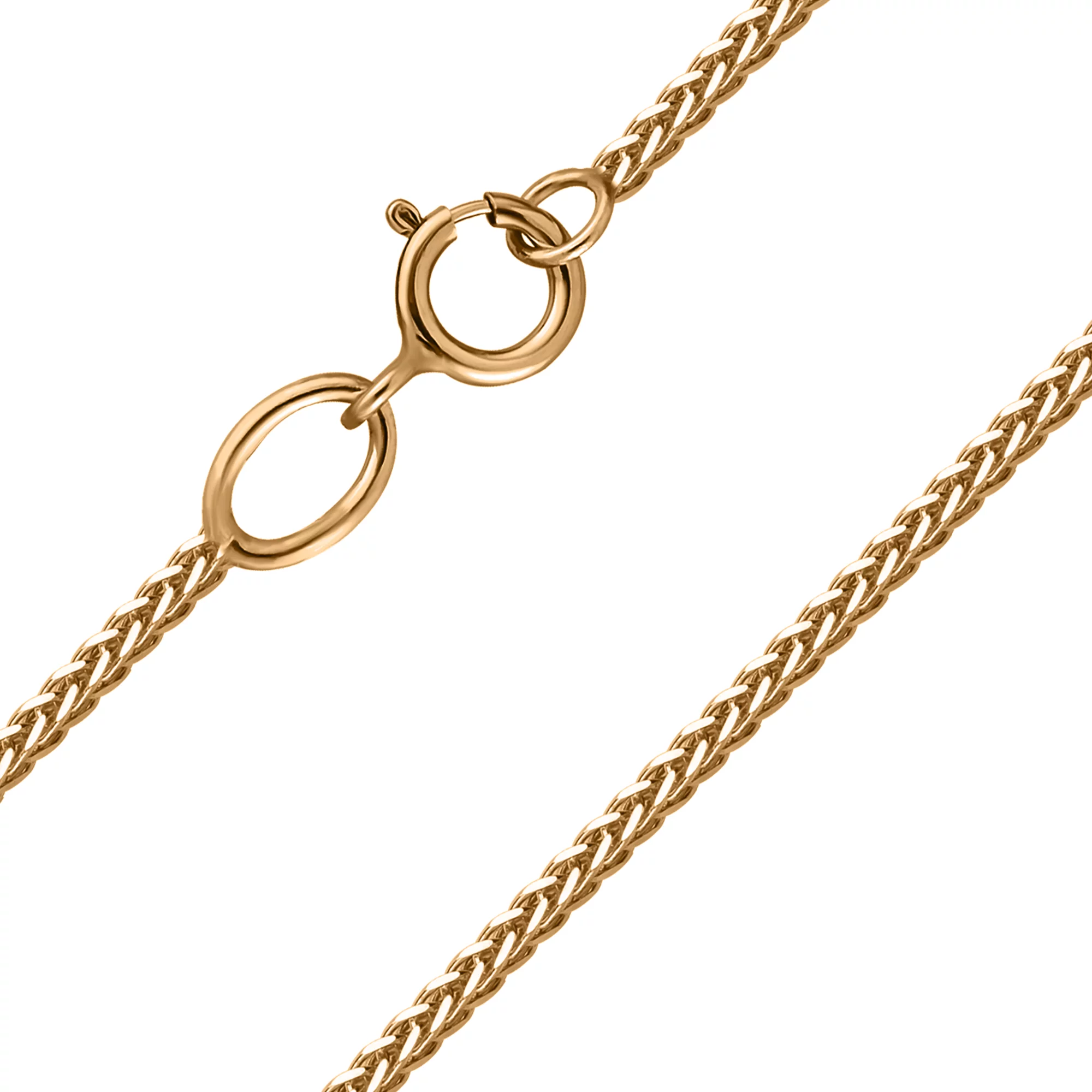 Изысканная цепочка из красного золота. Изделие имеет 585 пробу с теплым оттенком, что достигнуто благодаря добавлению меди в сплав. Украшение выполнено в технологии плетения, отличается особой прочностью и износостойкостью. Соединяет цепочку на шее замок карабин, который гарантирует надежное крепление без риска потерять ее. Этот тип замка выдерживает нагрузки больше, чем другие подобные варианты. Цепочка из красного золота — это универсальное изделие как для мужчины, так и для женщины. Подойдет для ежедневной носки или особых случаев.
