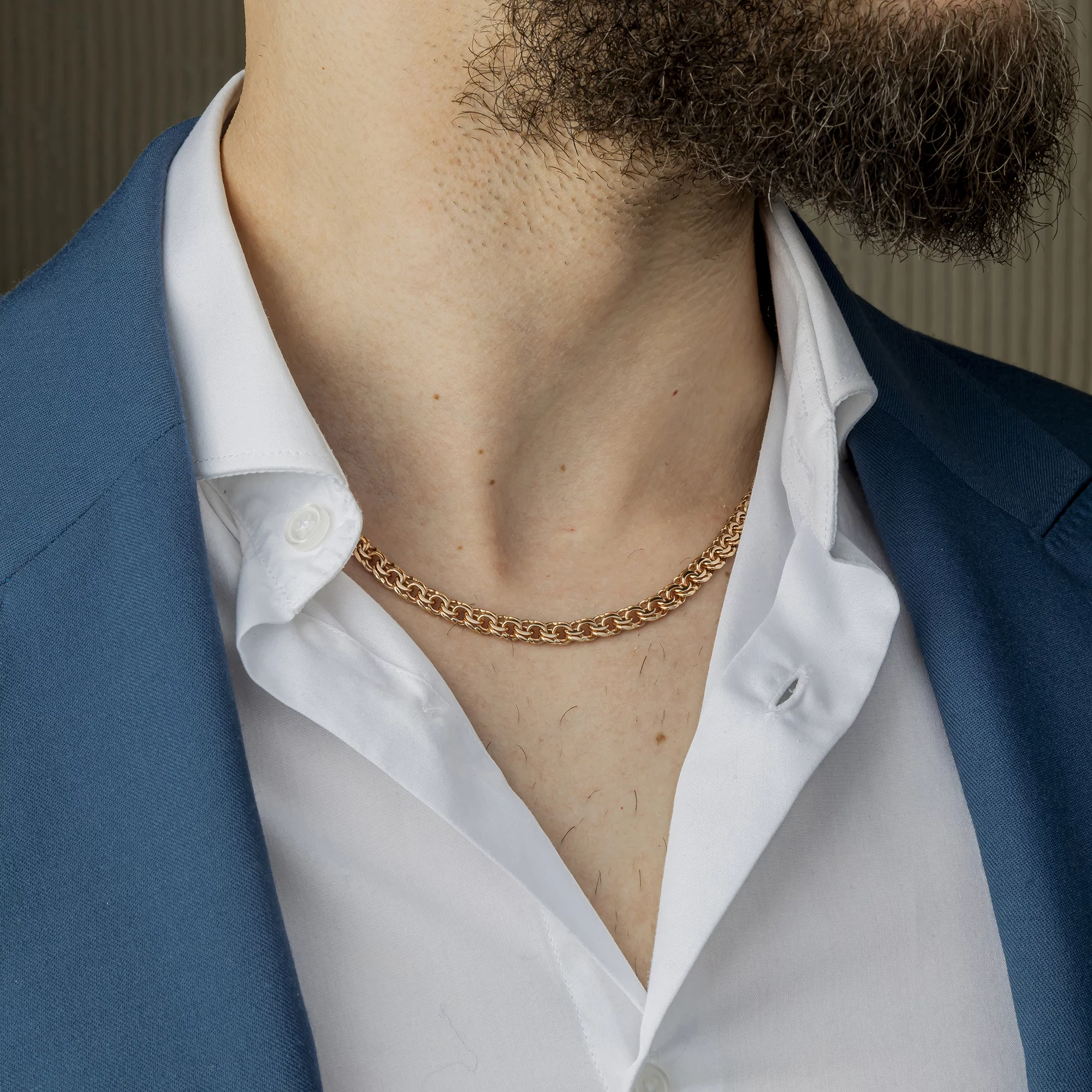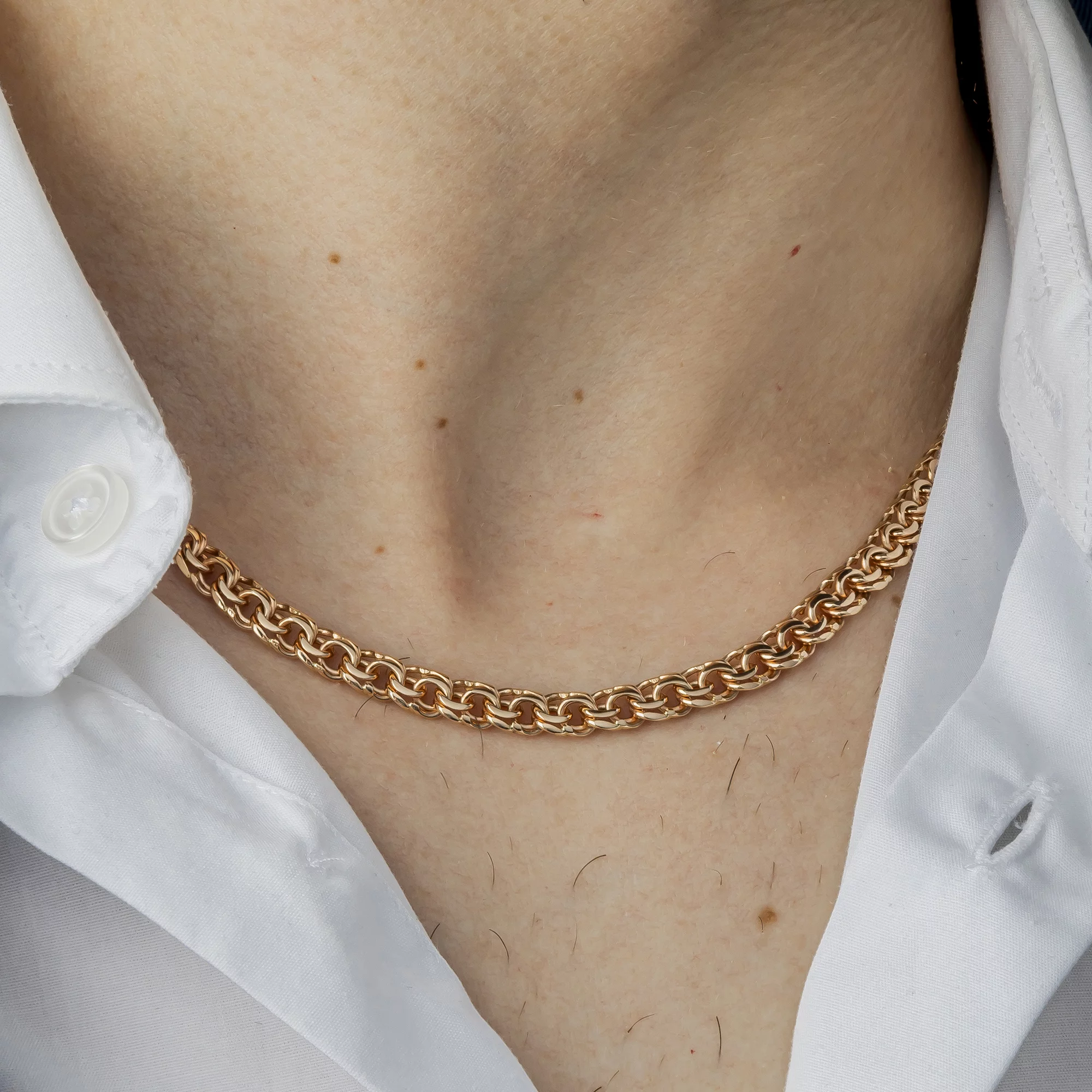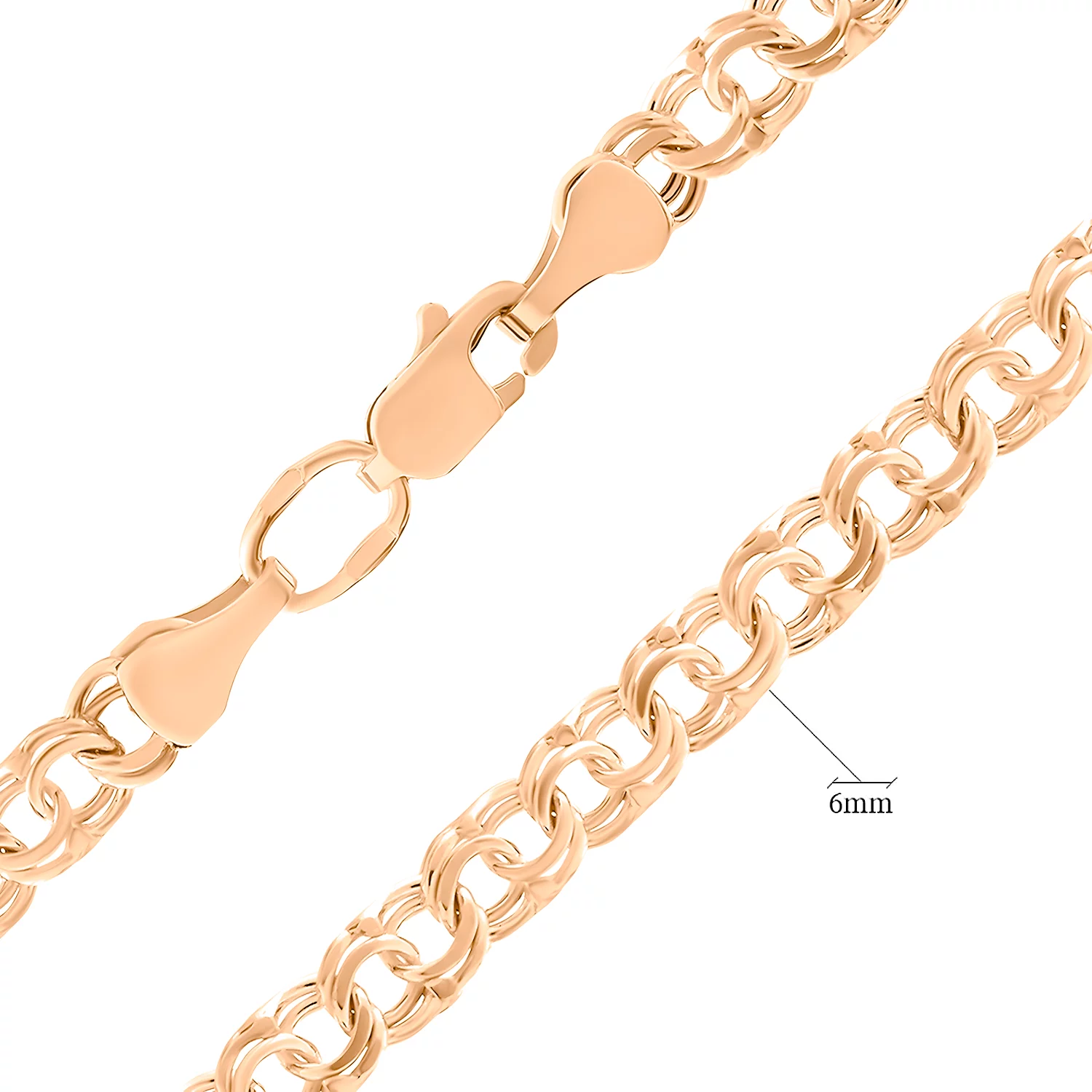 Цепочка, выполненная из красного золота 585 пробы, символизирует роскошь и благородство. Драгоценность создана с применением плетения плоский бисмарк. Классический вариант отличается двойным закручиванием звена по спирали. Украшение фиксируется на шее карабиновым замком, который характеризуется надежностью. Ювелирное изделие подойдет как под повседневный наряд, так и дополнит деловой костюм для ужина с партнерами. Удивите близкого человека подарком, украшенным подвеской или кулоном. Презентуйте драгоценность в честь дня рождения, юбилея или свадьбы.