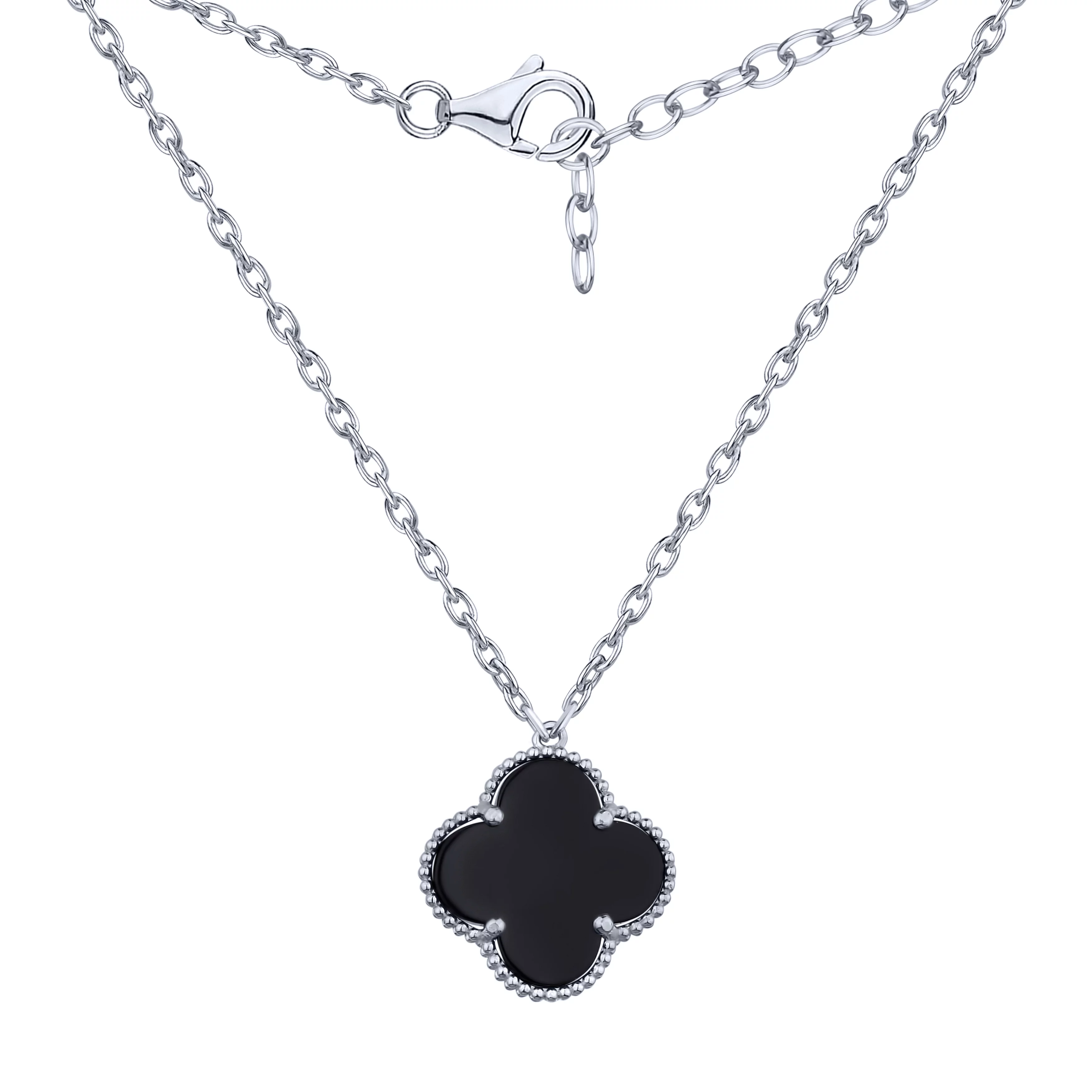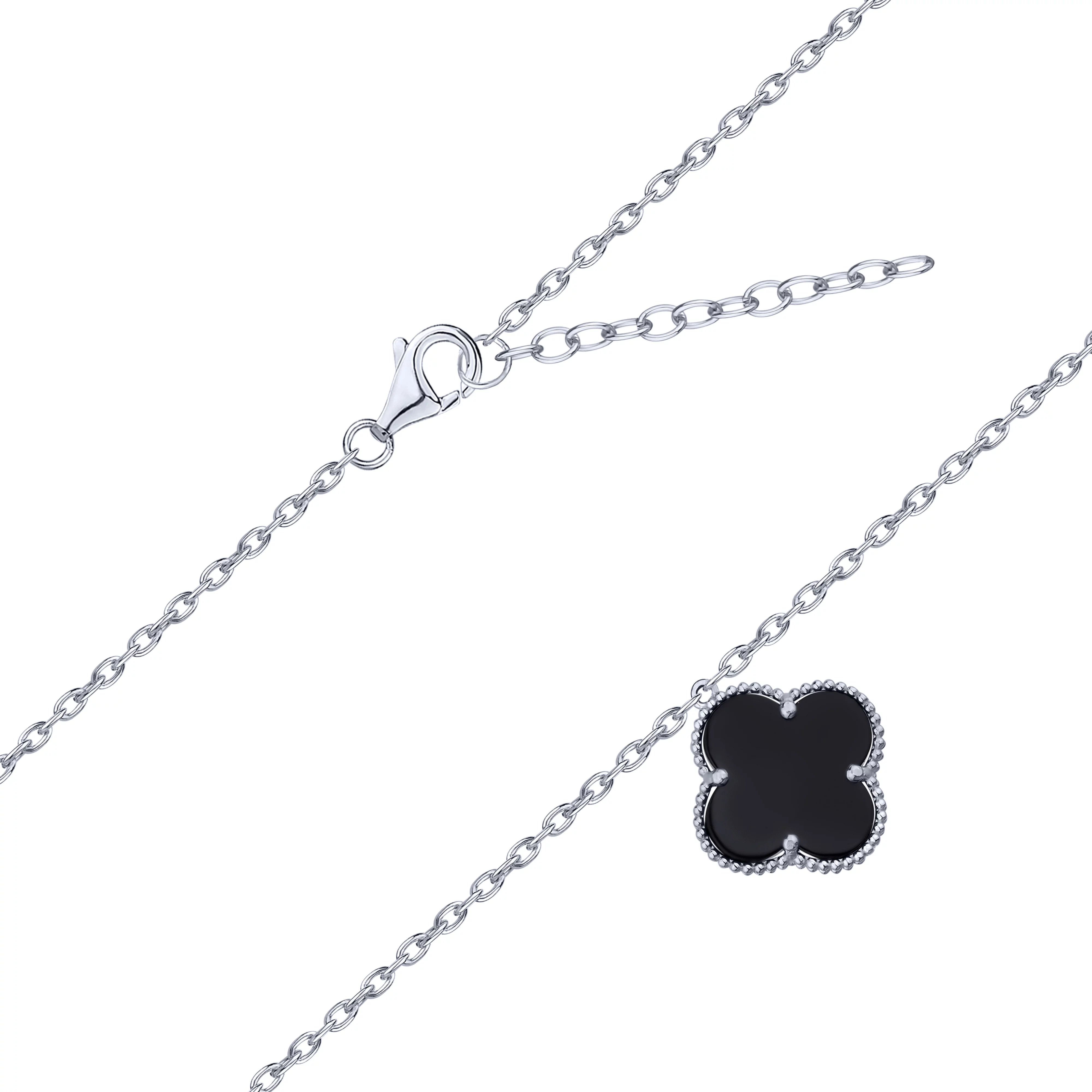 Серебряное кольє с подвесом "Клевер" с ониксом якорное плетение - 1822877