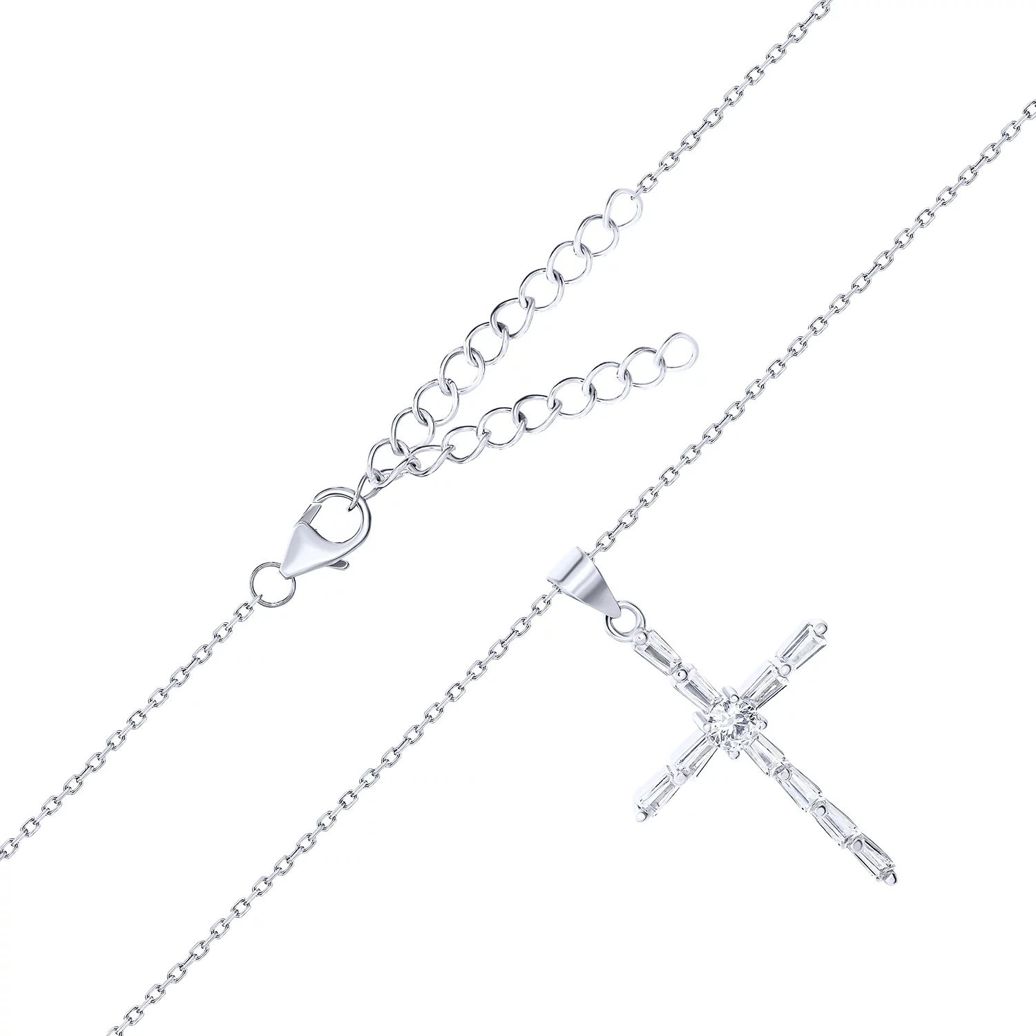 Стильное серебряное колье-галстук "Крестик" с фианитами и эмалью с якорным плетением - 1963114