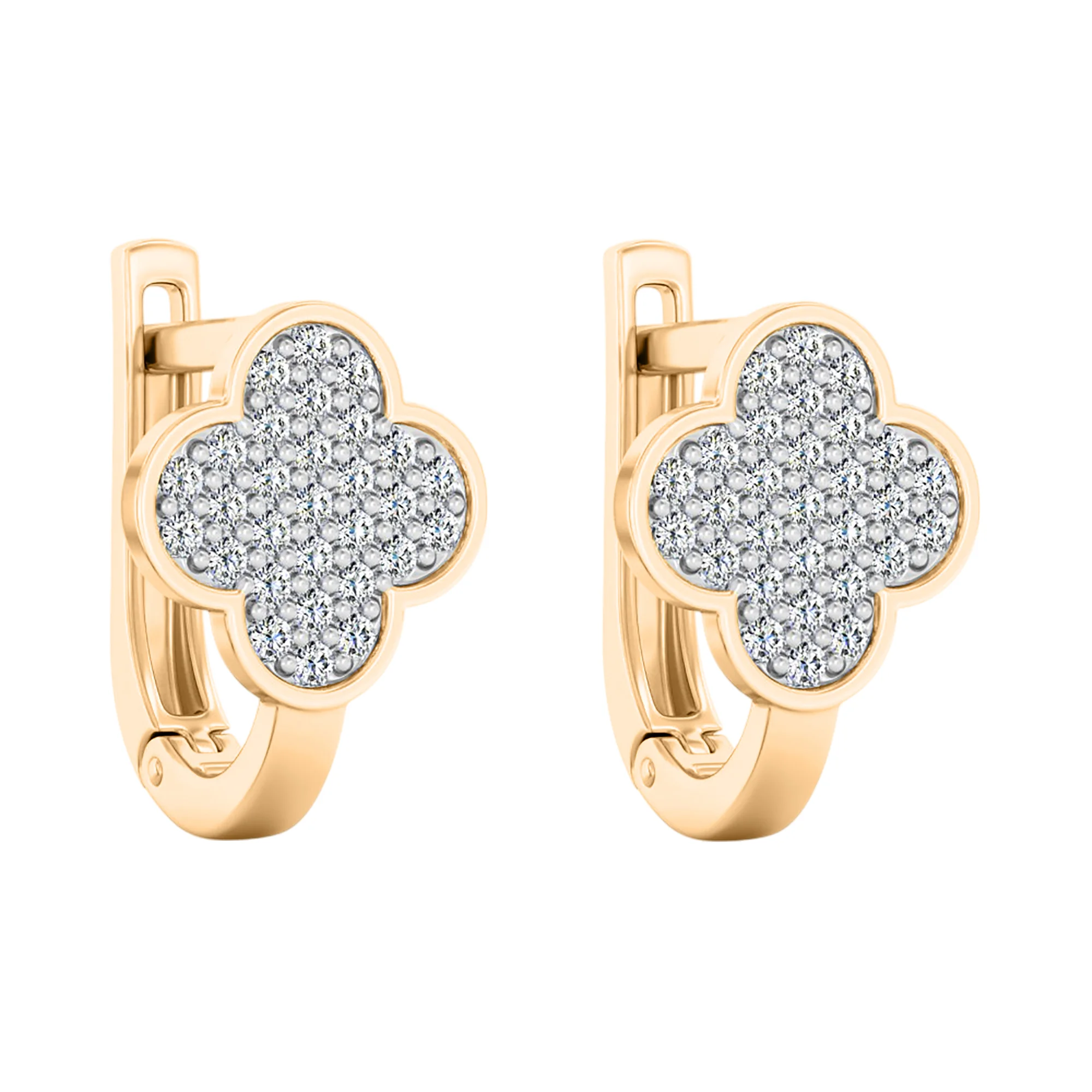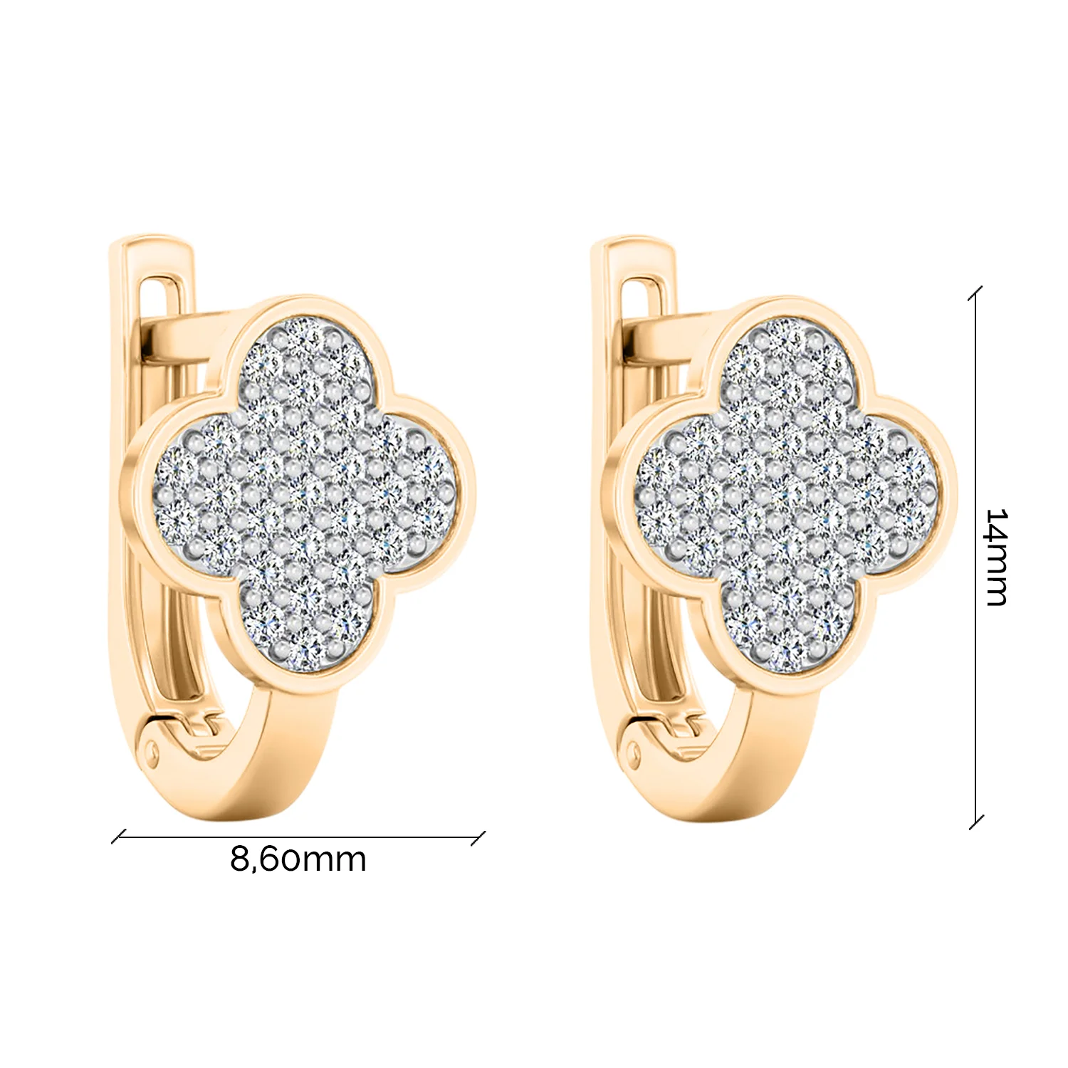 Сногсшибательные серьги с клевером – излюбленная тема модниц. Вашему вниманию предлагается модель из красного золота. В центре самОй цветочной композиции рассыпались словно звезды фианиты. Надеть эту красоту проще простого – достаточно застегнуть английскую застежку. И вот вы уже в дамках – королева вечера, роскошная жрица обаяния.