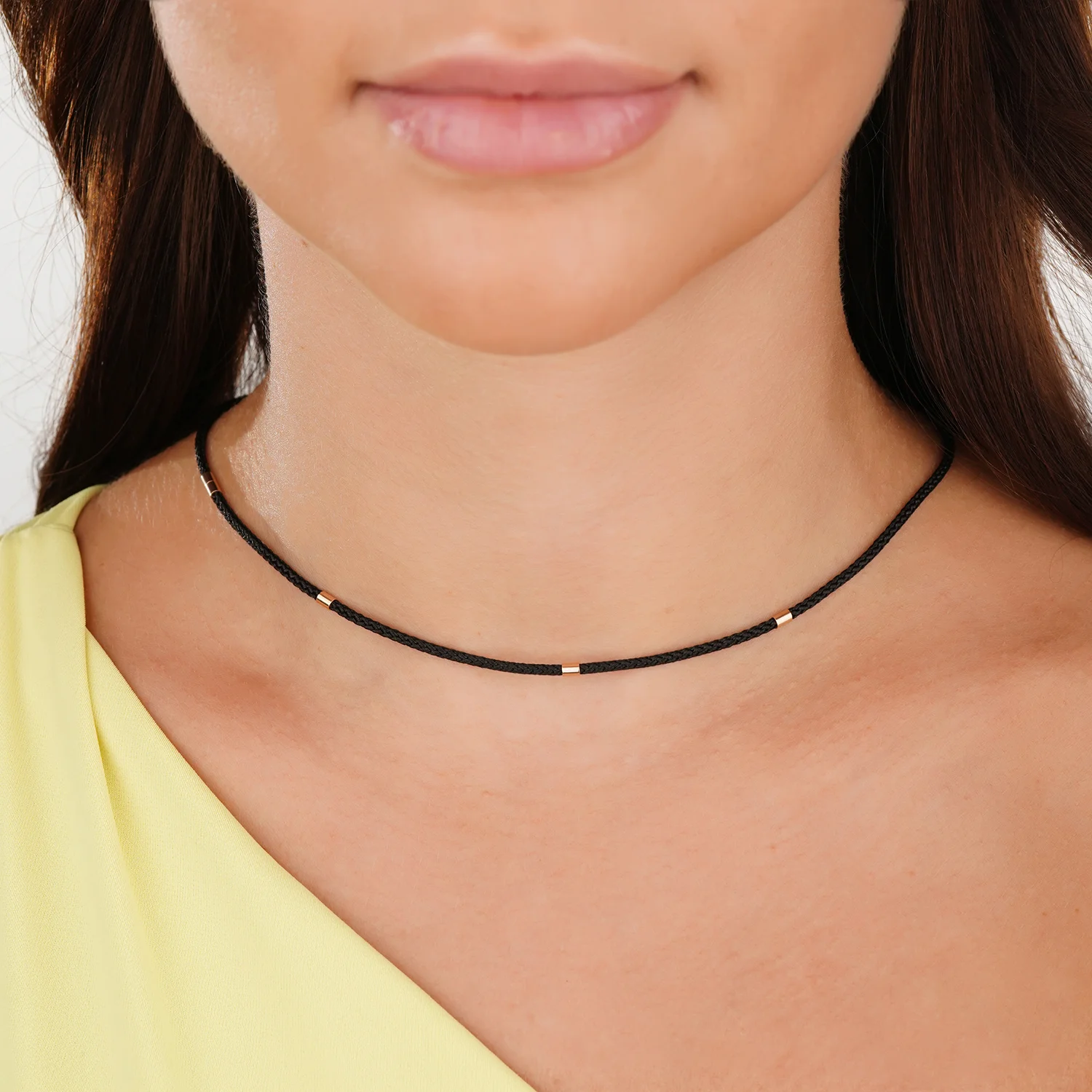 Ювелирный шелковый шнурок со вставками из красного золота — универсальное украшение, которое подходит мужчинам и женщинам независимо от возраста. Изделие выглядит стильно благодаря контрастному сочетанию черного цвета нитей и элементов из яркого драгоценного металла 585 пробы. Застежкой служит круглый шпрингельный замок, который прочно соединяет концы шнурка. Сочетать такое ювелирное изделие можно с крестиками, кулонами, амулетами. Шелковый шнурок с гармонично подобранной подвеской дополнит офисные, спортивные, повседневные образы.