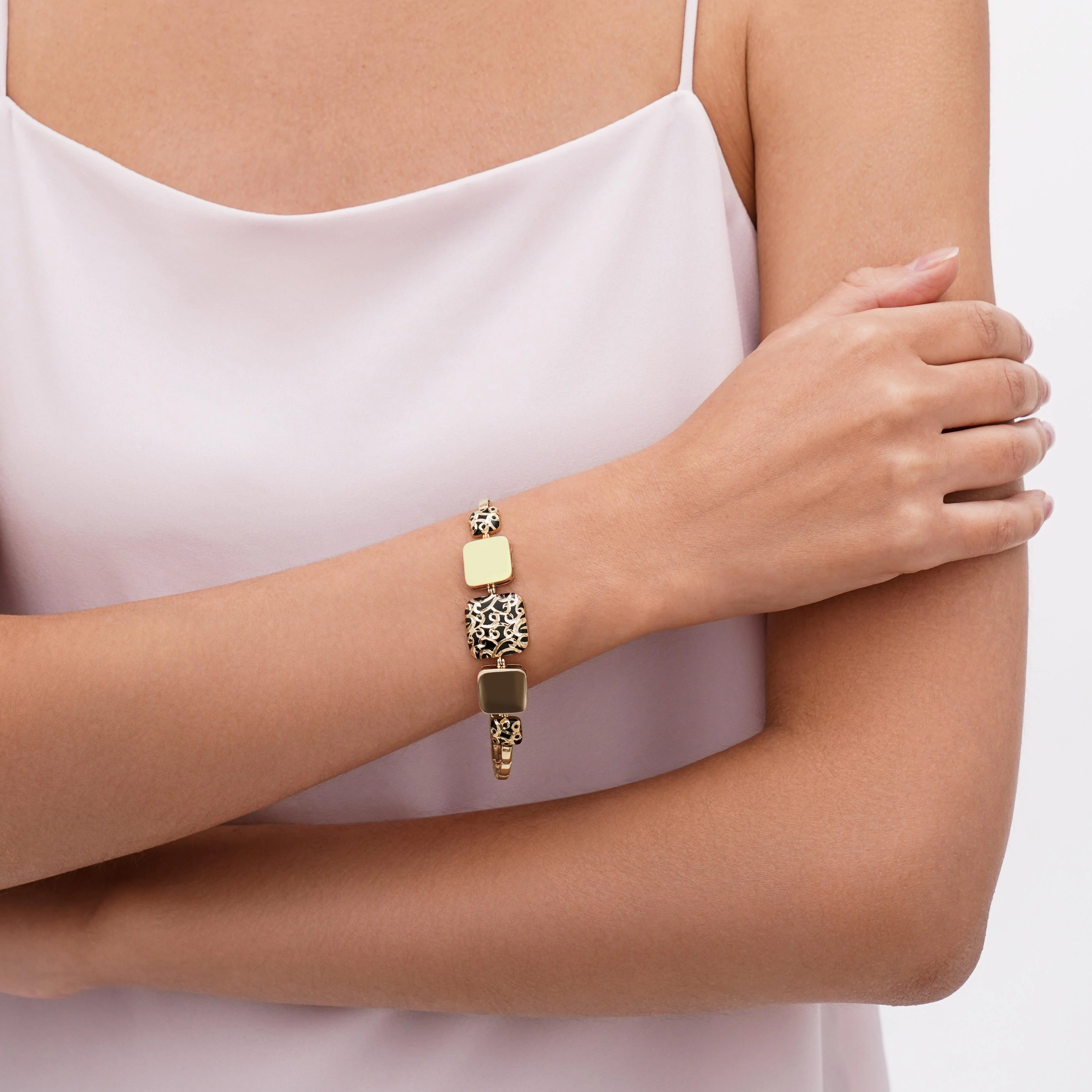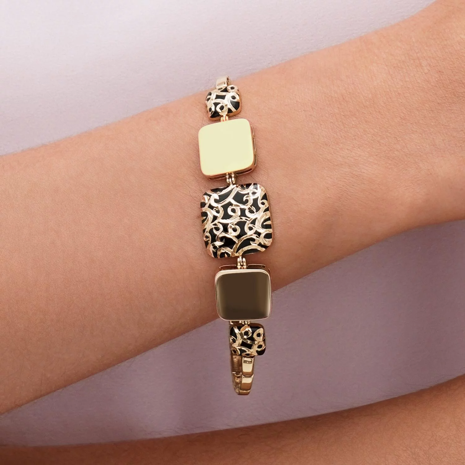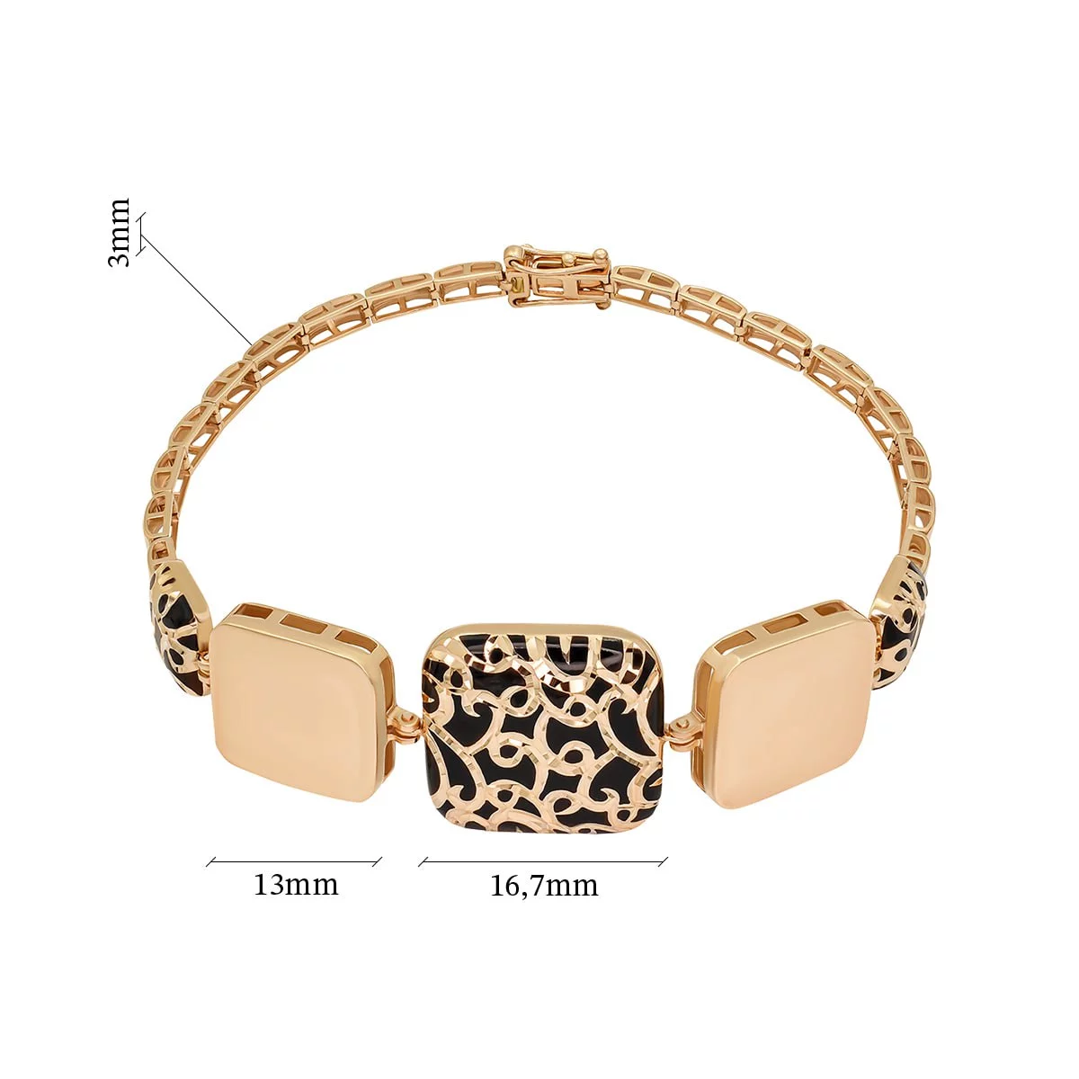Жесткий браслет из красного золота с эмалью с первого взгляда впечатляет роскошным дизайном. Центральными элементами ювелирной композиции служат три квадрата разных размеров с двумя кругами по бокам. Полностью золотые фигуры чередуются с покрытыми эмалью. Гладкий черный материал с витиеватыми узорами создает контраст в дизайне браслета. Для надежной фиксации на запястье предусмотрен замочек в виде пряжки. Его удобно застегивать самостоятельно без посторонней помощи. Браслет станет ярким акцентом в повседневном или вечернем образе в сочетании с другими украшениями.