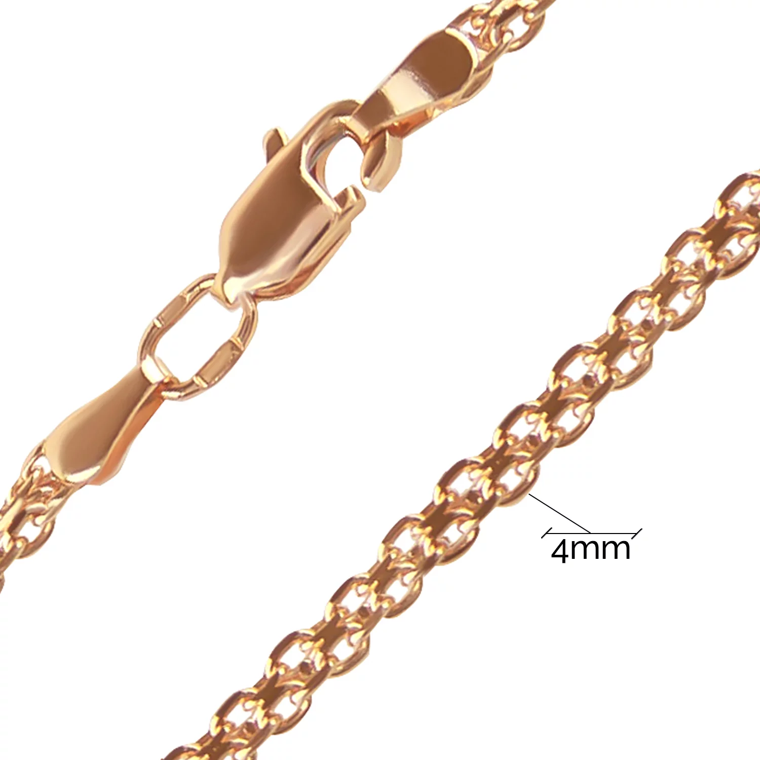 Роскошная объемная цепочка из красного золота 585 пробы. Выполнена в технике прочного плетения «бисмарк», которое обеспечивает высокую прочность изделия и привлекательный вид. Застегивается на миниатюрный аккуратный карабин, которым удобно пользоваться при надевании украшения, при этом не допускается самопроизвольное расстегивание. Эффектное изделие хорошо сочетается с разными стилями одежды, подходит для любого пола и повода. Украшение эффектно дополнит имидж, придаст уверенности и подчеркнет высокий социальный статус.
