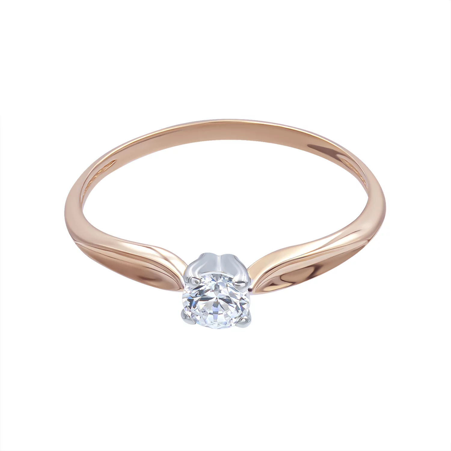 Изящное кольцо из красного золота прекрасно подойдет для нежной молодой девушки и взрослой женщине. Ювелирное изделие выделяется тонким основанием, которое расширяется ближе к сердцевине. По центру красиво сверкает цирконий круглой огранки — аналог бриллианта. Вставка размещена на базе из белого золота и удерживается крапанами. Такой продуманный фундамент еще больше подчеркивает филигранность полудрагоценного камня. Классическое украшение идеально подойдет для предложения руки и сердца, обручальной церемонии или в качестве подарка.