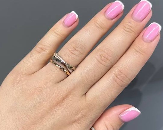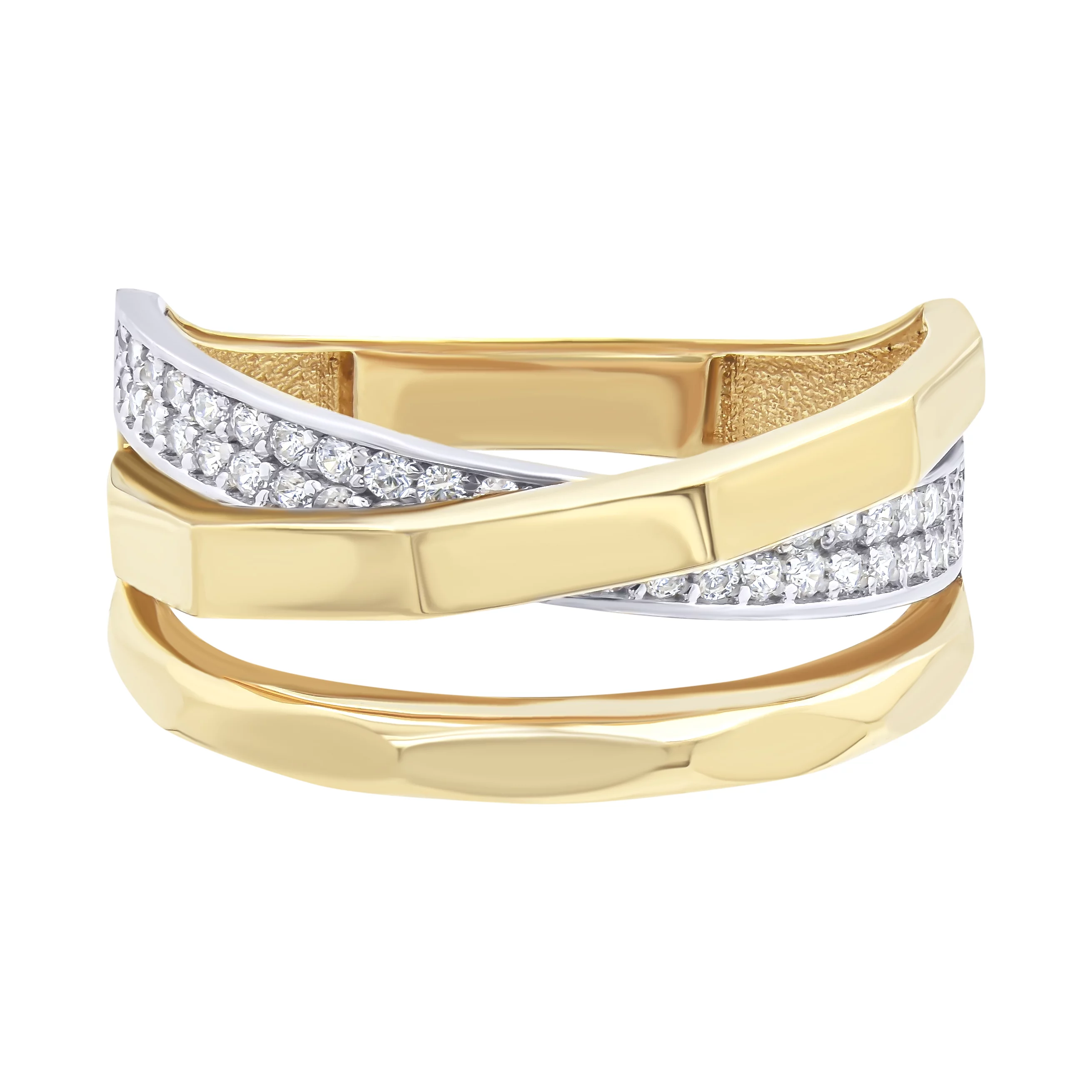 Золотое кольцо с циркониями — элегантное женское украшение, получившее эксклюзивный дизайн. Приятный оттенок драгоценного металла 585 пробы — результат добавления в сплав меди. Она не только обеспечивает специфический цвет золота, но и делает его более прочным, устойчивым к механическому воздействию. Внешняя часть кольца состоит из трех независимых элементов в виде полос полукруглой формы, которые соединены с противоположных сторон. Две из них из красного золота с рифленой поверхностью, одна — из белого металла с дорожками из циркониев.