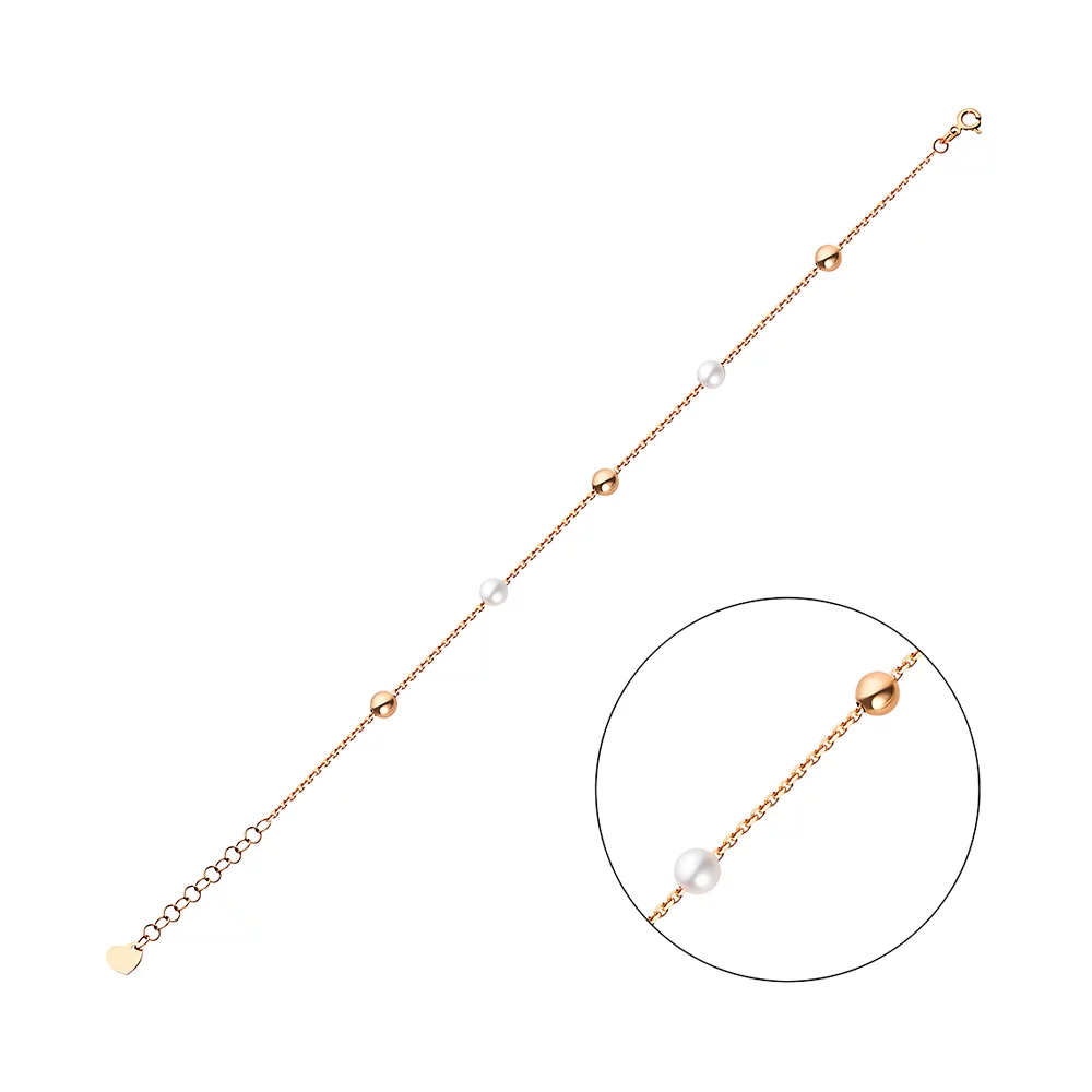 Золотой браслет в красном цвете "Шарики" с жемчугом плетение якорное - 1531715