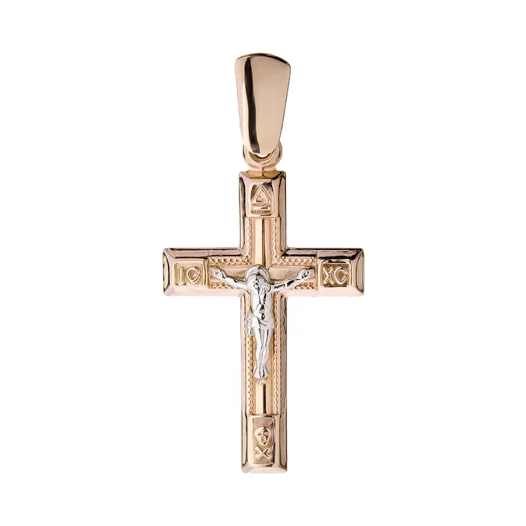 Золотой крестик привлекает насыщенностью оформления с утонченными деталями. В первую очередь взор падает на интересную фактурность изделия — несколько выделенных ободков, перекладины с текстовыми вставками и объемная центральная фигура распятия контрастного белого цвета. Благодаря богатому оформлению украшение выглядит массивным и увесистым, но четкость геометрии форм уравновешивает дизайн, лаконично завершая картину. Комбинация красного и белого золота красиво играет на фоне общей фактурности. Качественный сплав отличается стойкостью и прочностью для надежной службы.