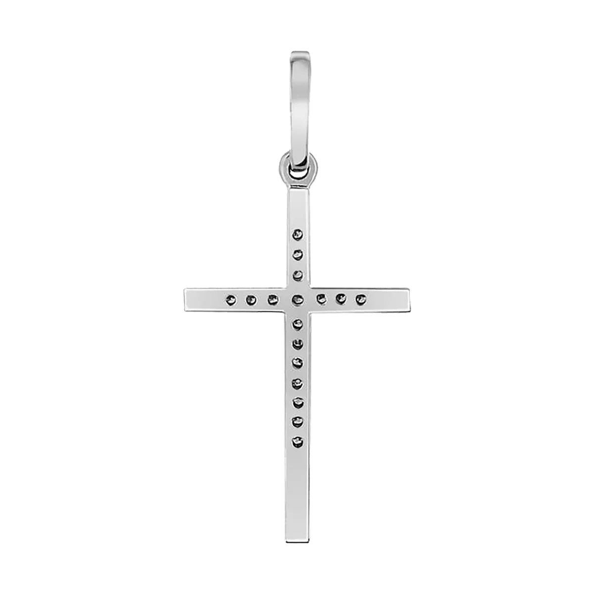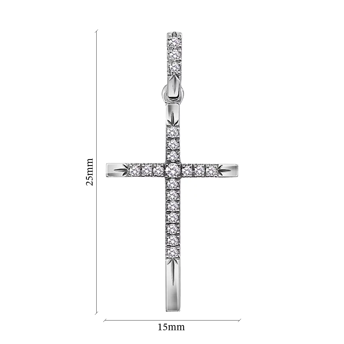 Крестик из белого золота изготовлен в классическом стиле. Модель инкрустирована дорожкой бриллиантов по всей поверхности и на подвесном ушке. На концах перекладин гравировка. Изделие из 585 пробы, что означает, что он на 58,5% состоит из чистого металла. В мягкий аурум добавляют лигатурные элементы, чтобы придать прочность и устойчивость к деформациям. Украшение подойдет для женских деловых образов и торжественных. Это отличный вариант подарка к Новому году, дню рождения или другому важному празднику.
