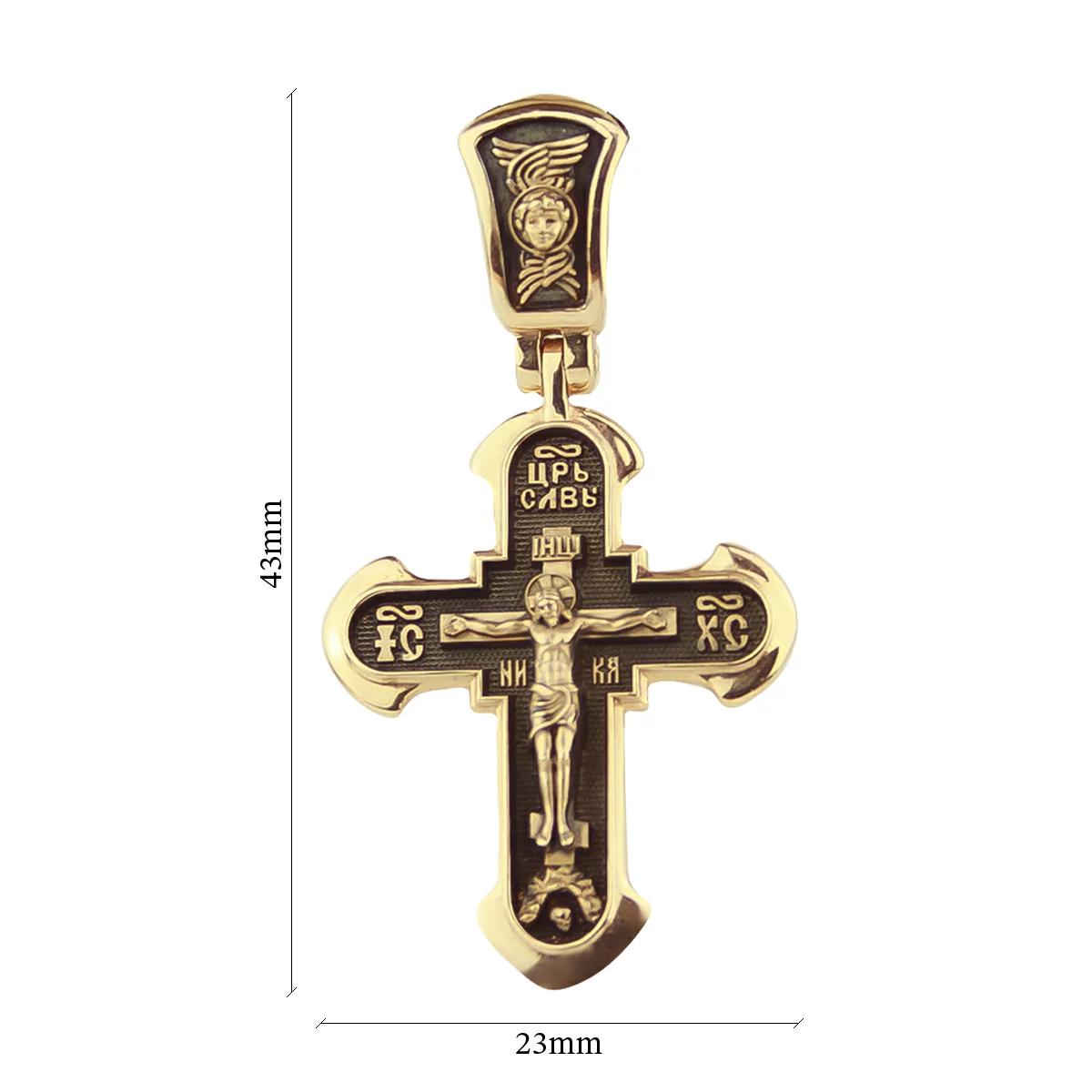 Золотой крестик с чернением с изображением распятия на передней стороне и с символической надписью на обороте. Выполнен из драгоценного металла 585 пробы благородного красного оттенка, декорирован чернением, которое придает украшению изящный старинный вид. Имеет лаконичные скругленные края. Изделие подойдет на обряд крещение, а также может стать подарком к любому поводу для дорогого человека, поскольку предназначено для детей и взрослых обоих полов. Подходит для регулярной носки как личного оберега верующего, как символа принадлежности к православным христианам.
