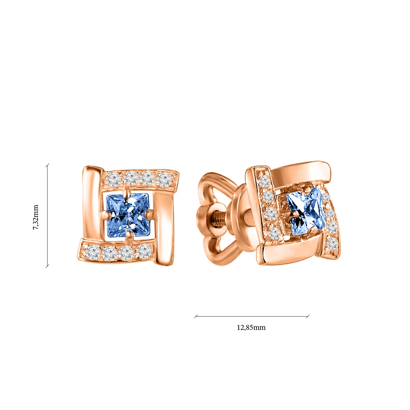 Золотые серьги-гвоздики с циркониями — настоящее произведение искусства. Женское украшение выполнено в классическом стиле. Конструкция из четырех прямых полос, соединенных в квадрат. В центре крапановая закрепка надежно удерживает голубой цирконий. Красивый камень получил форму квадрата. Две противоположные стороны конструкции из красного золота 585 пробы украшены маленькими белыми камнями. Серьги-гвоздики оснащены винтовой застежкой. Она считается одной из самых надежных — прочно удерживает сережки, исключая произвольное расстегивание.