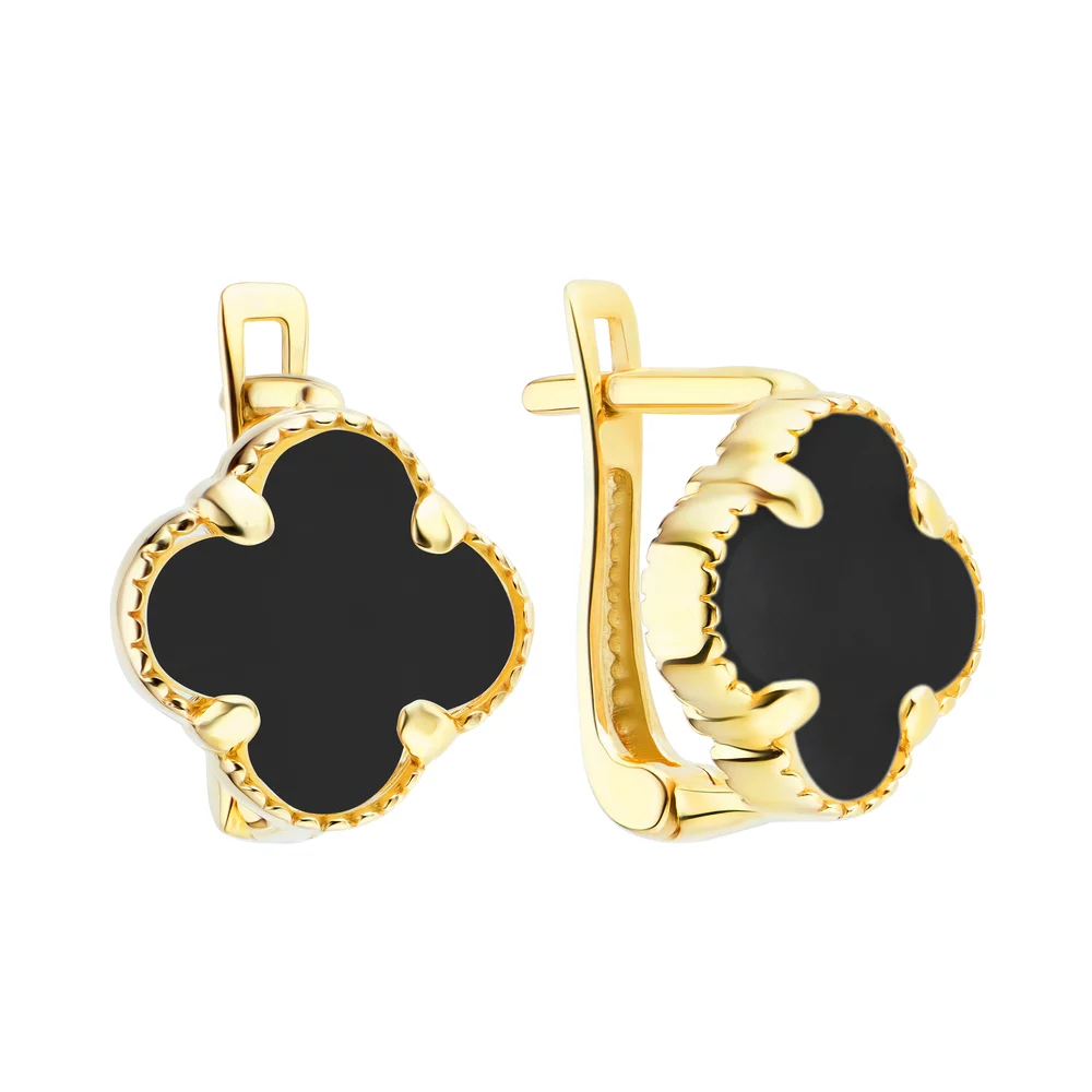 Серьги "Клевер" с ониксом в желтом золоте - 1503209
