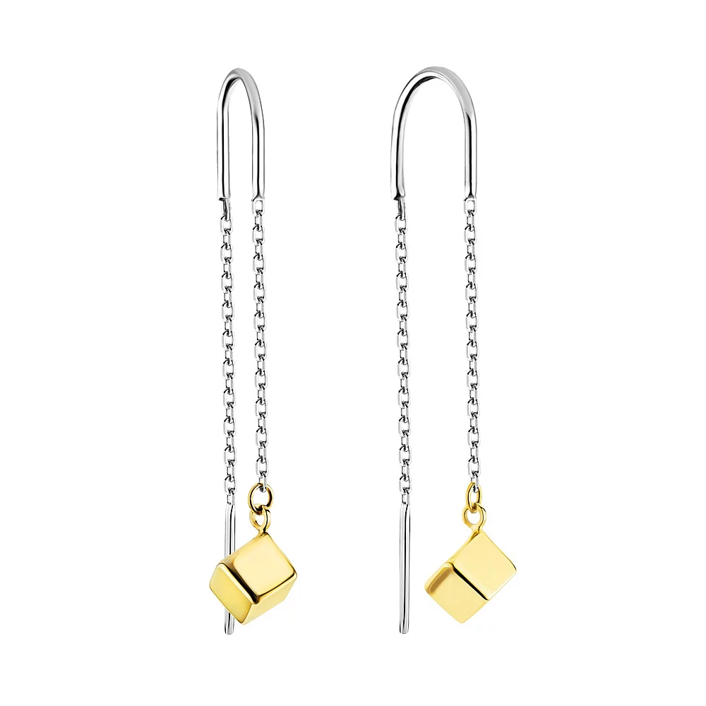 Серьги-протяжки с подвесами "Кубик" в комбинированном золоте - 1503367
