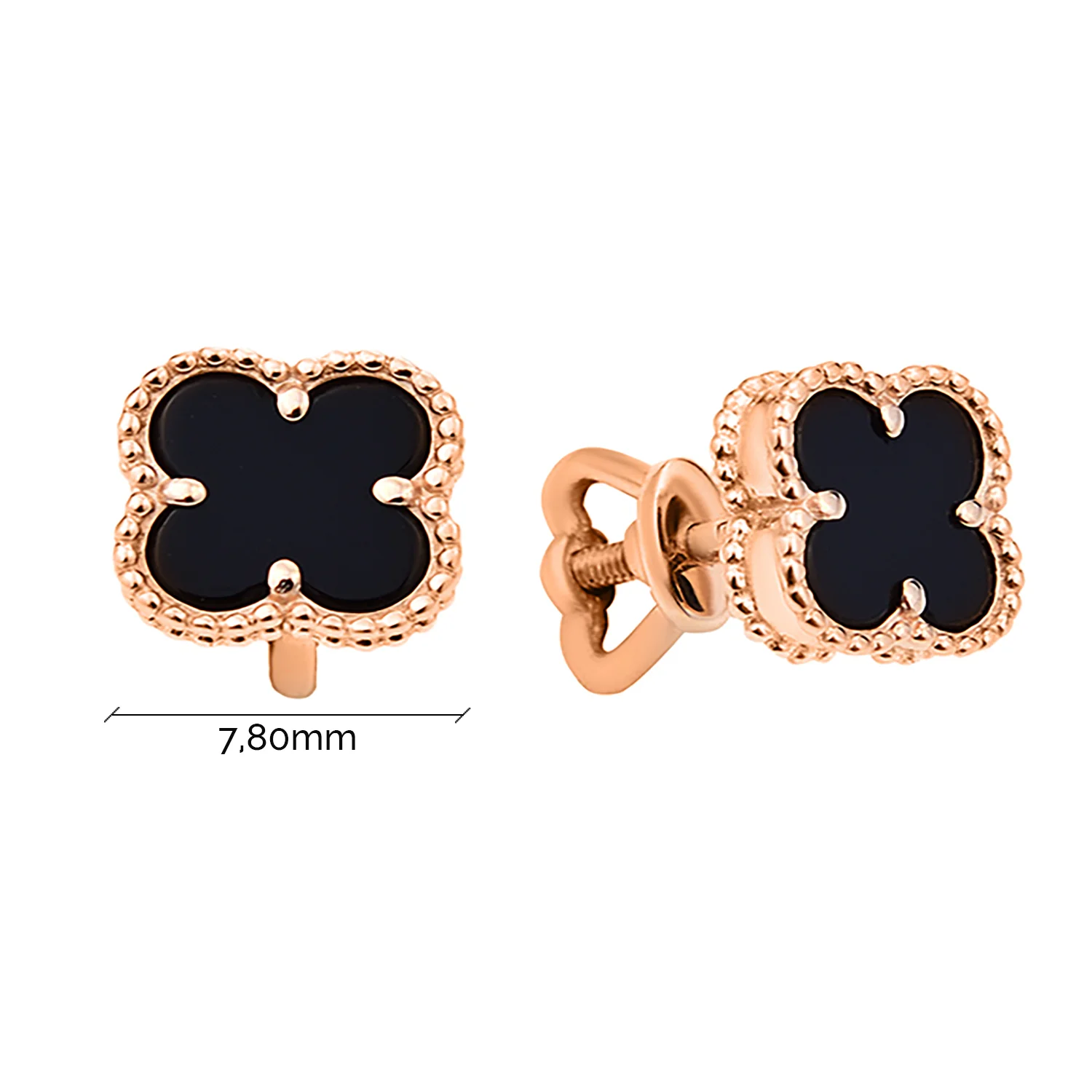 Стильные сережки-гвоздики "Клевер" из красного золота с ониксом - 1878296