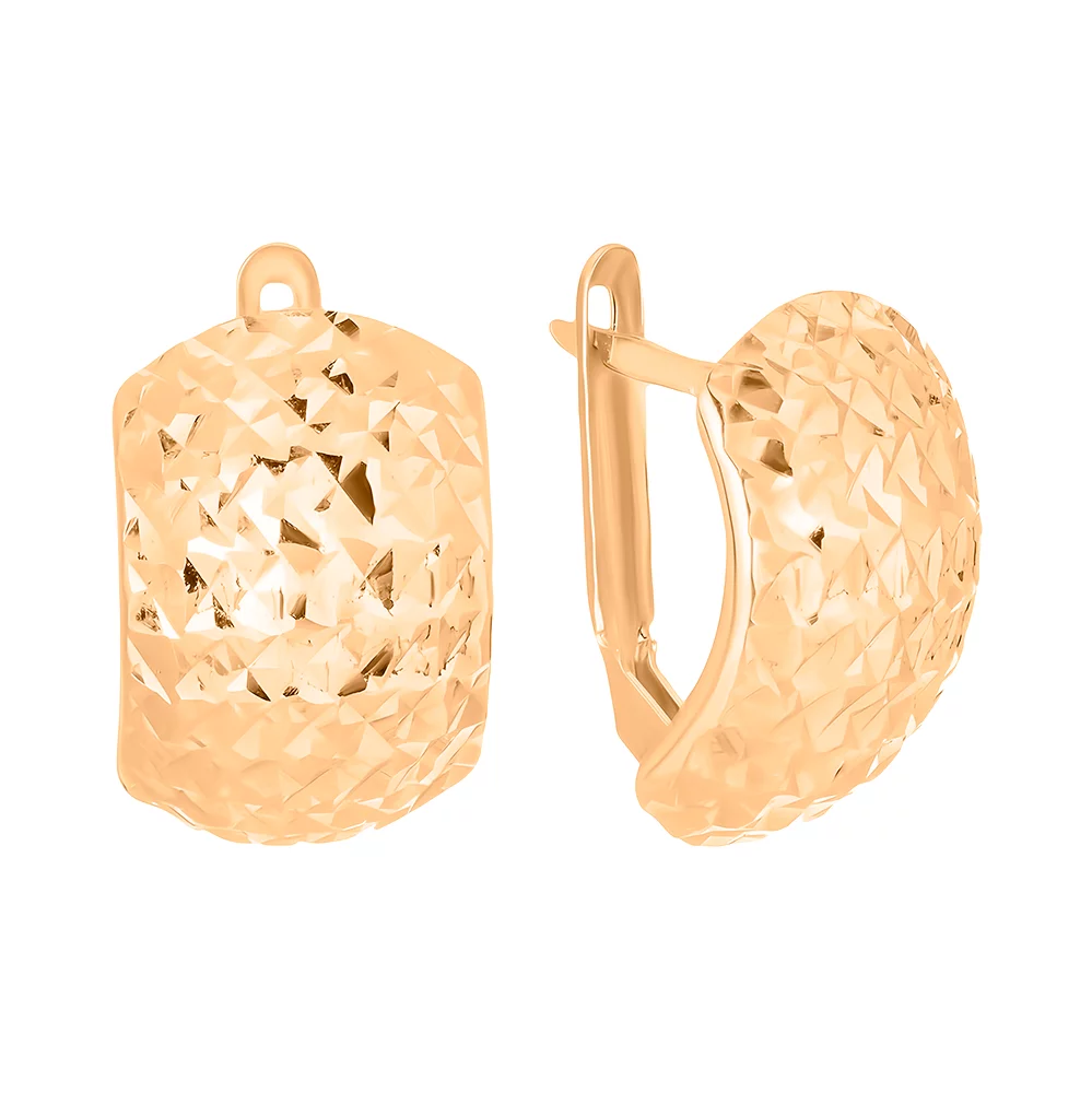 Серьги созданы из красного золота 585 пробы с добавлением техники декорирования алмазная грань. Ювелирное изделие украшено характерным узором, что добавляет ему оригинальности и уникальности. Драгоценность надежно фиксируется на ухе с помощью английского замка. Универсальный дизайн позволяет комбинировать серьги с повседневным нарядом или вечерним образом. Порадуйте близкого человека приятным подарком на свадьбу, годовщину отношений или крестины ребенка. Четкие линие и плавные изгибы притягивают внимание к украшению.