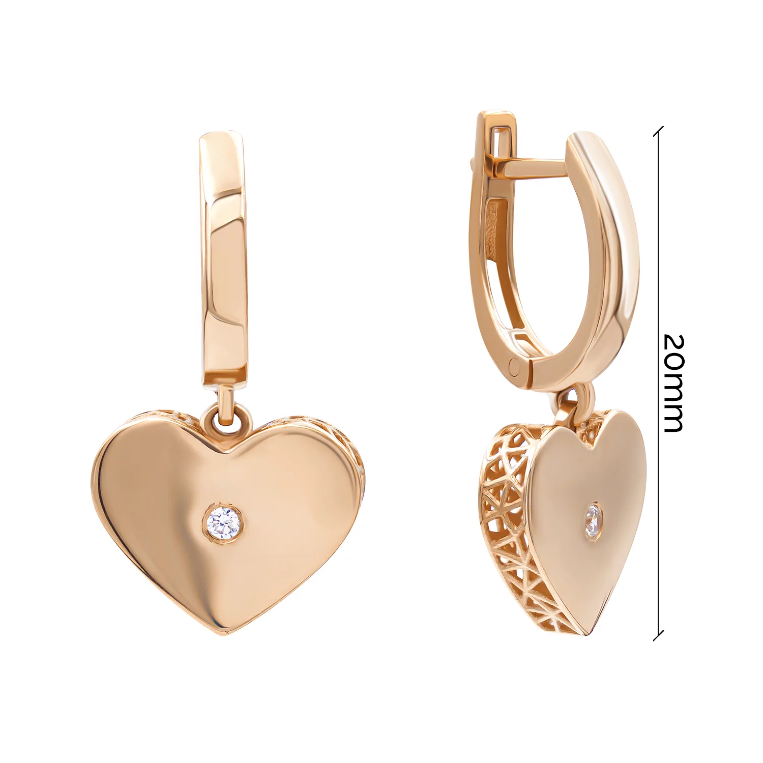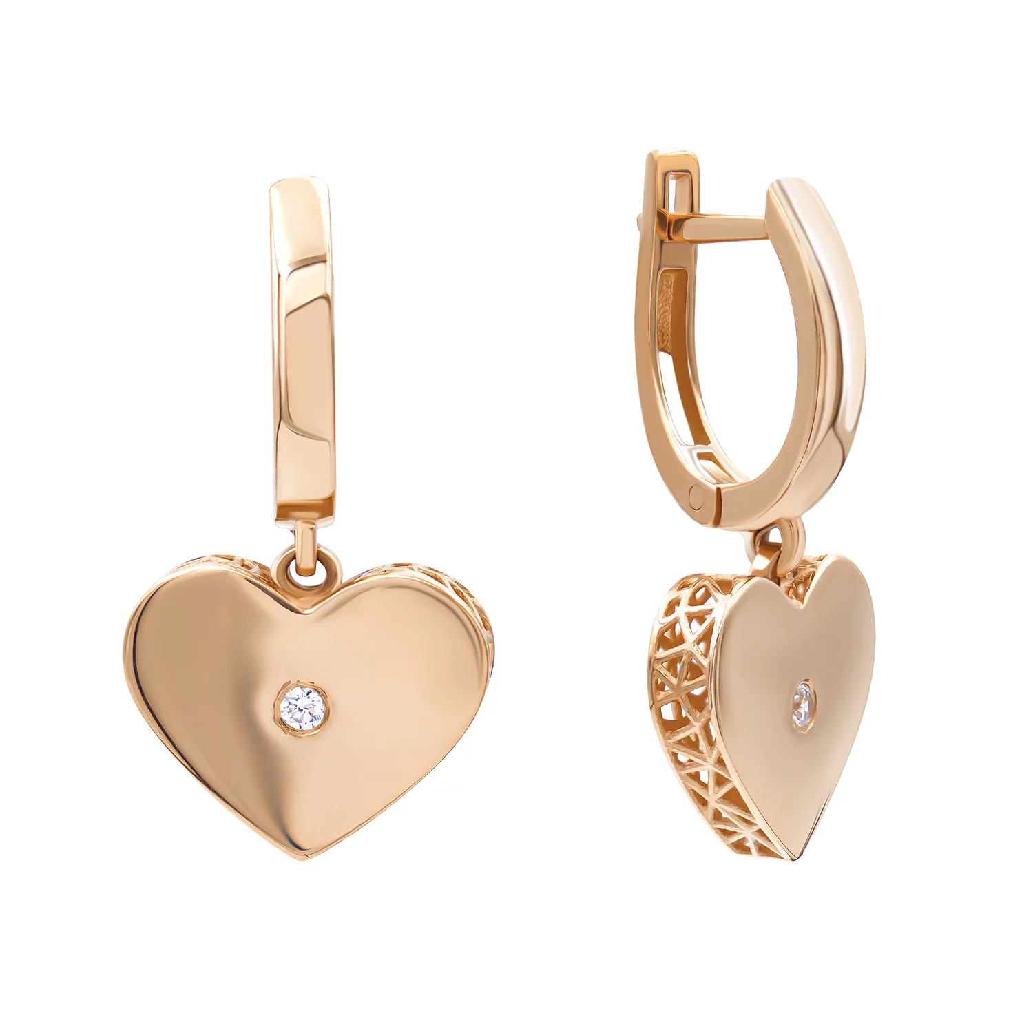 Сережки из красного золота с подвесками "Сердце" и фианитами - 1731047
