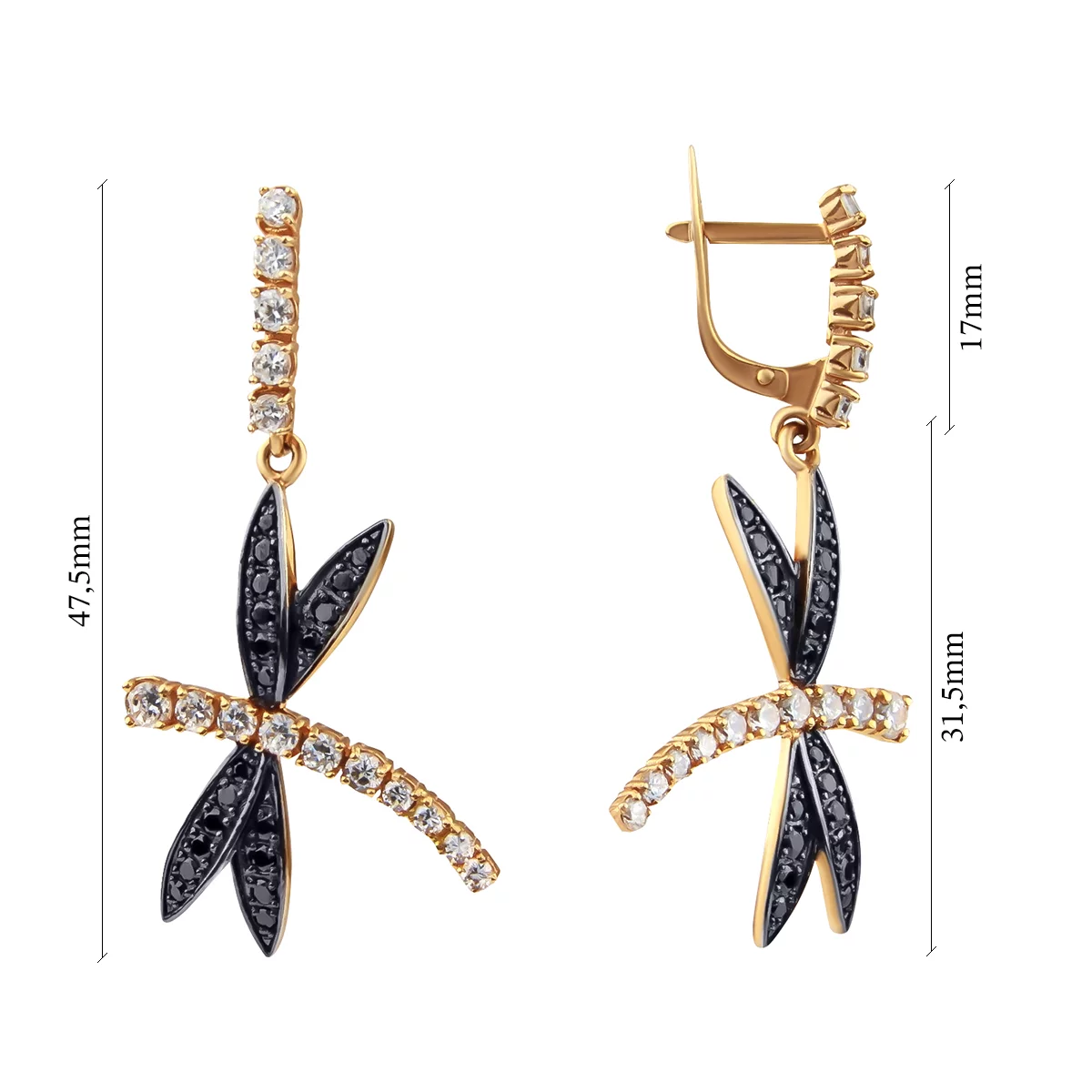 Золотые серьги с подвесами фианитом "Стрекоза" - 410846