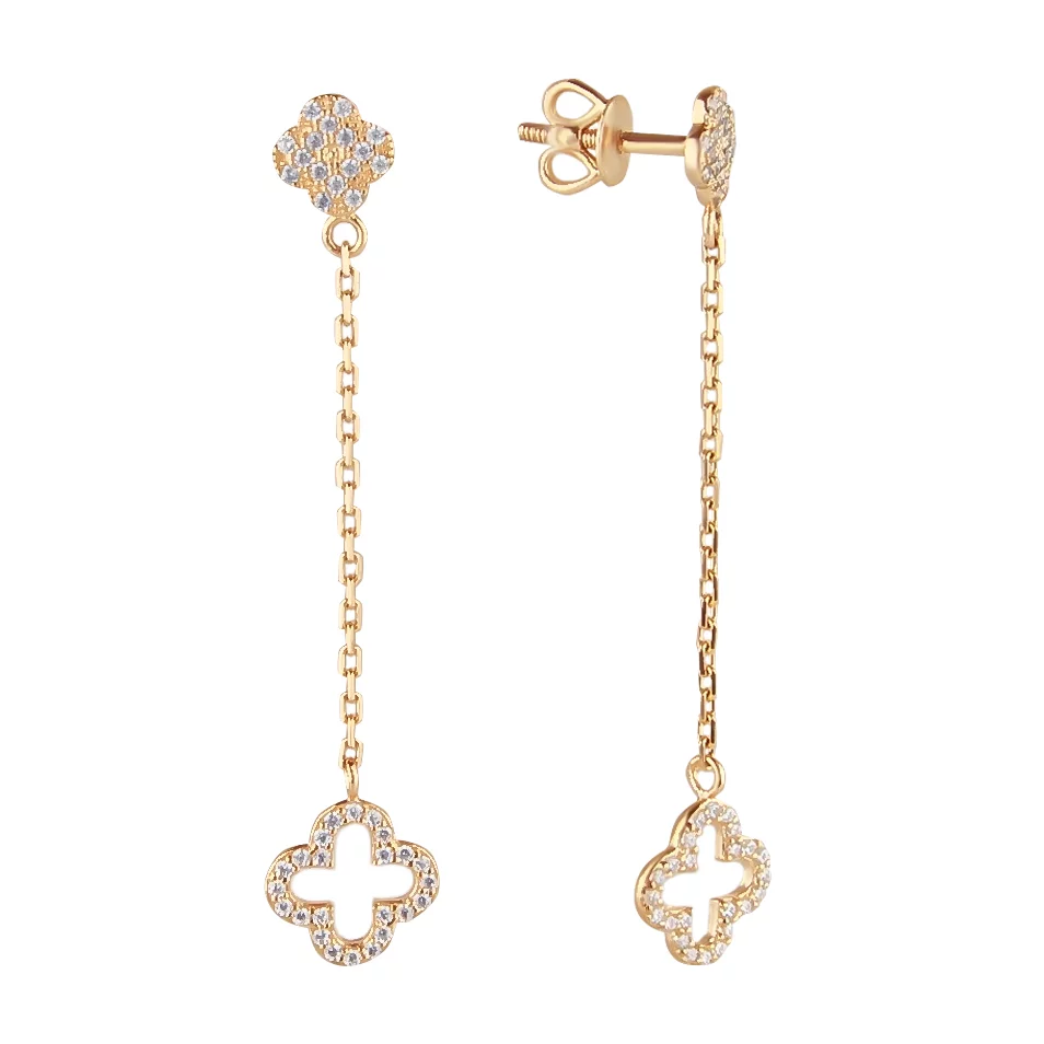 Сережки-гвоздики с подвесами Клевер и фианитом - 796488