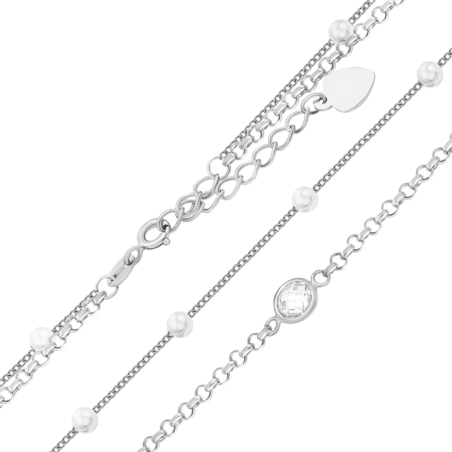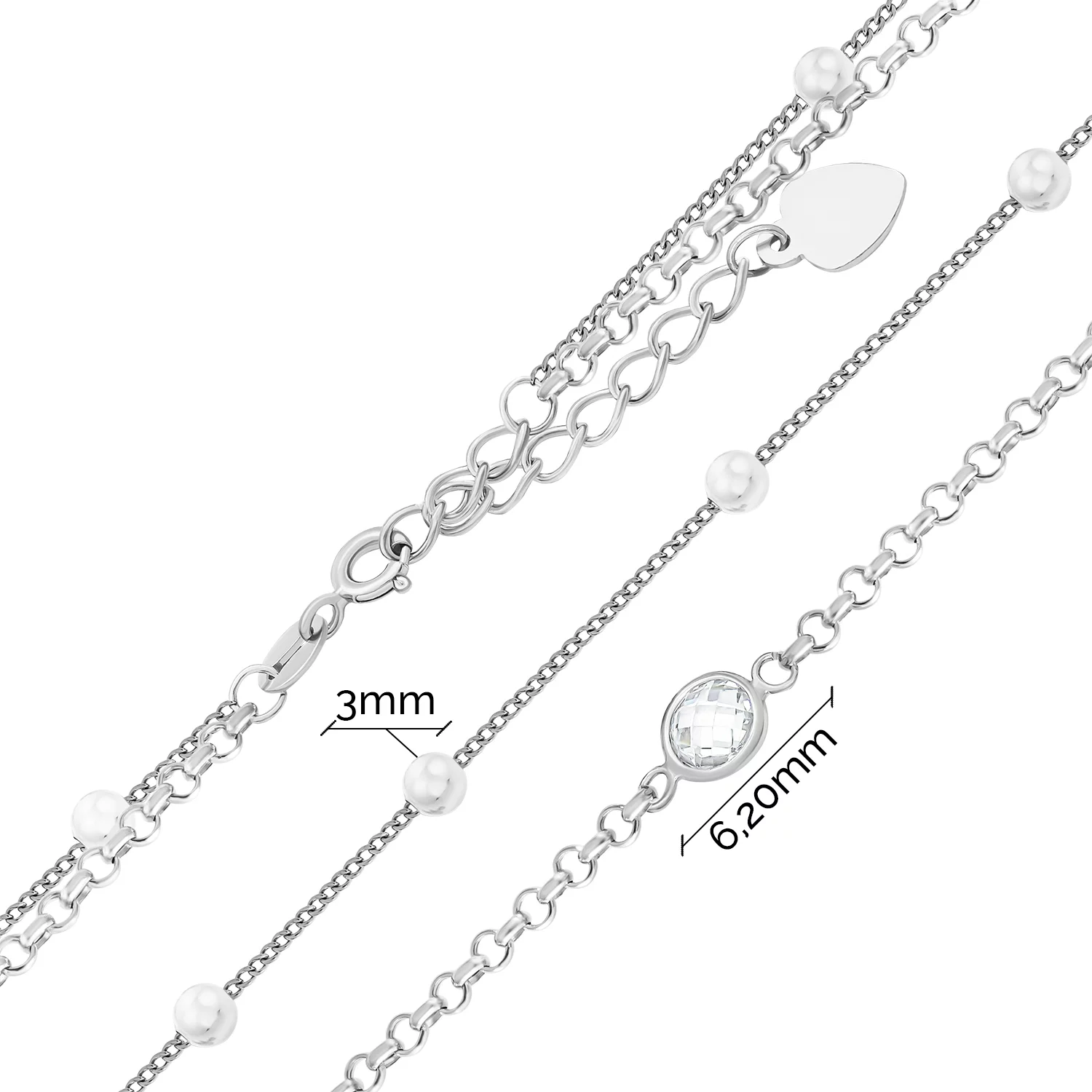 Подвійний срібний браслет з фіанітом і кульками подвійне плетіння - 1715007