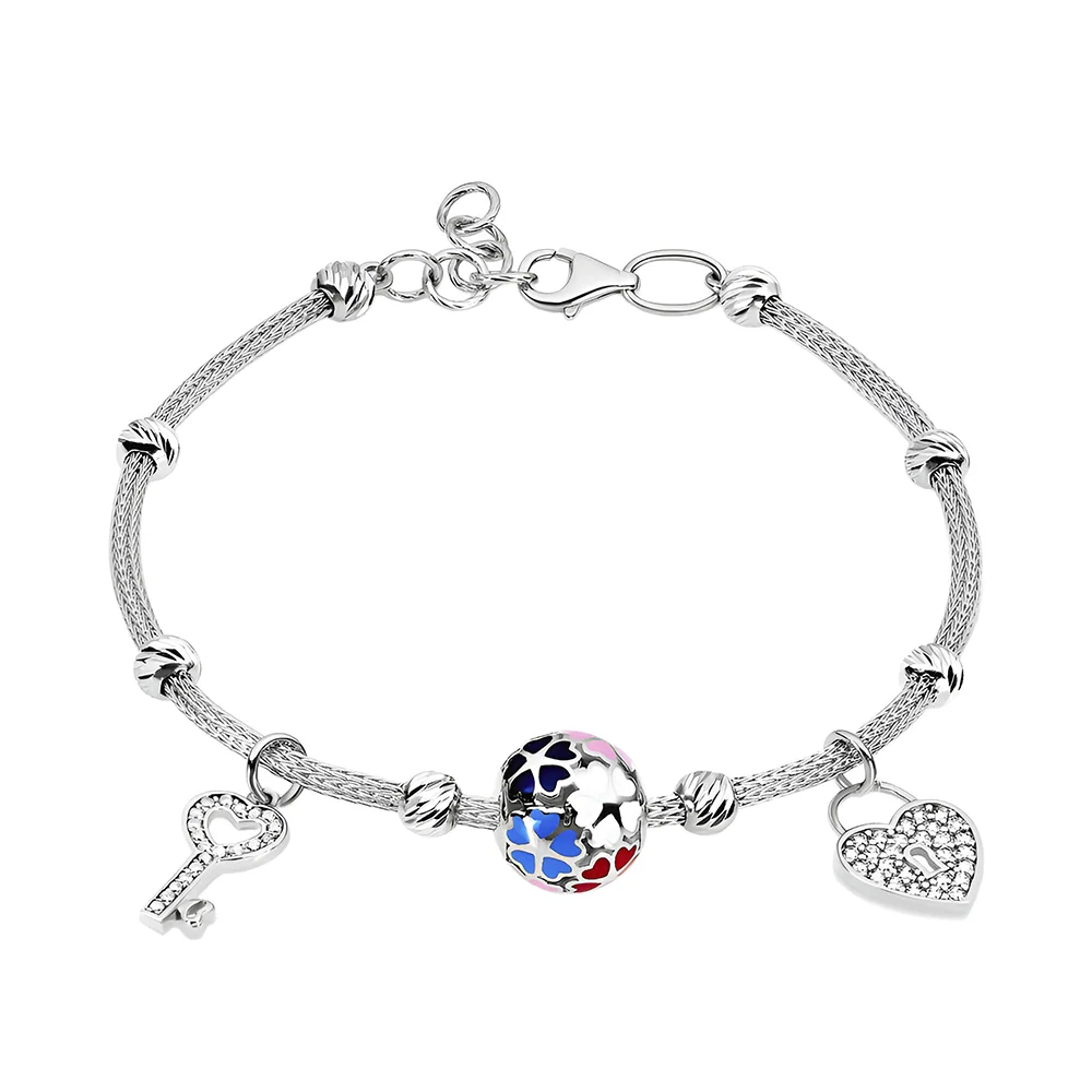 Браслет із білого золота з підвісками та фіанітами з алмазною гранню плетіння снейк - 2169349