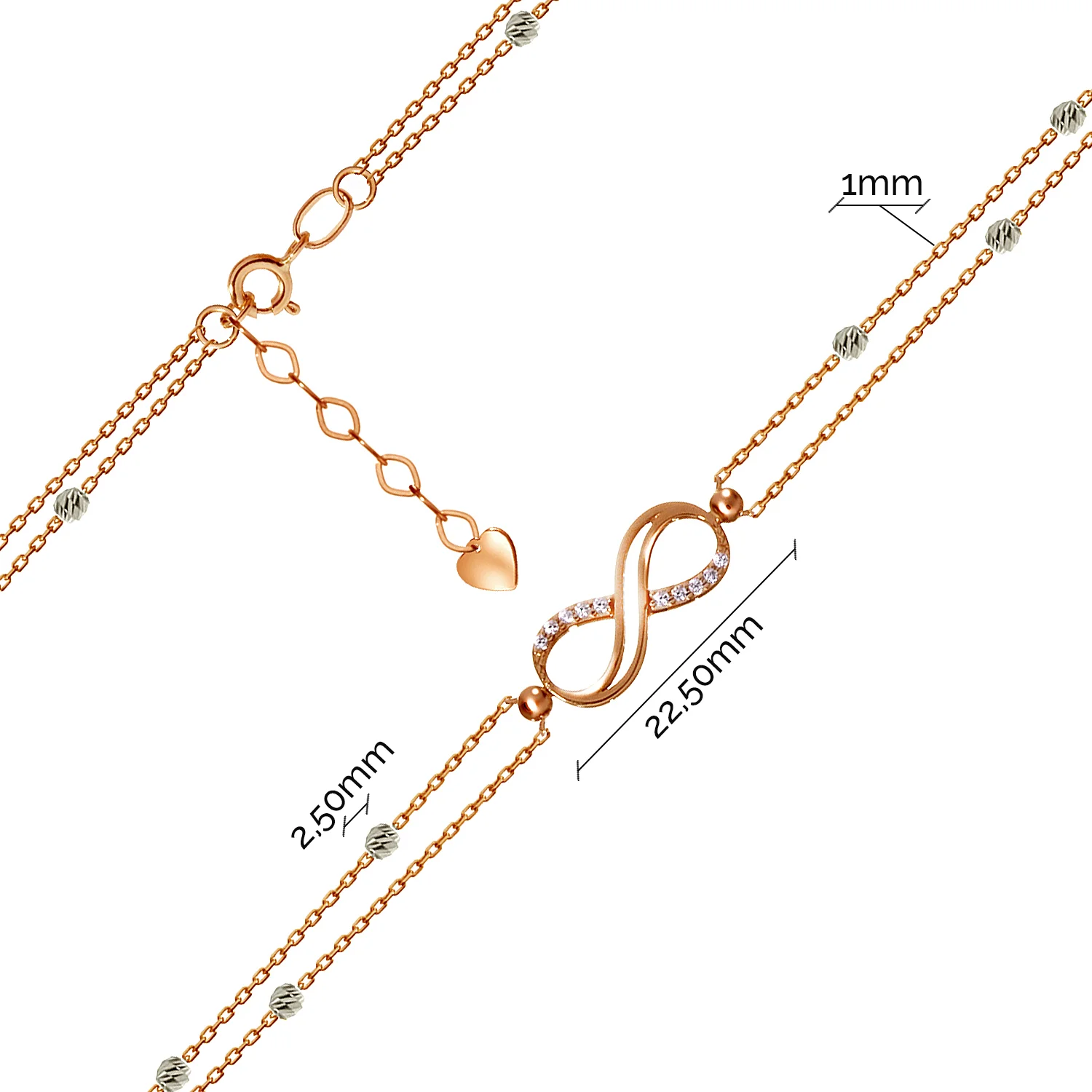 Браслет з червоного золота "Нескінченність" з фіанітами якірне плетіння - 1698653