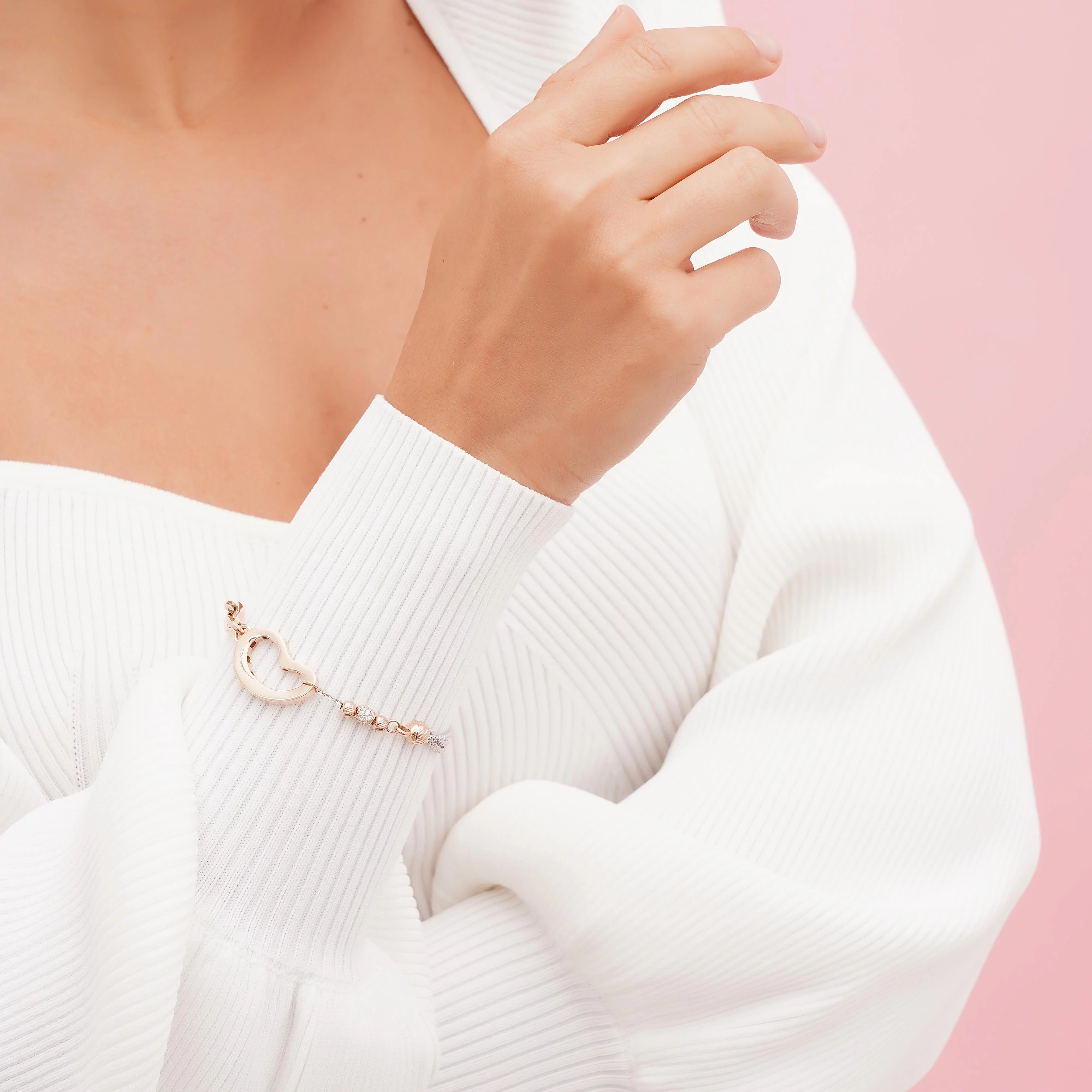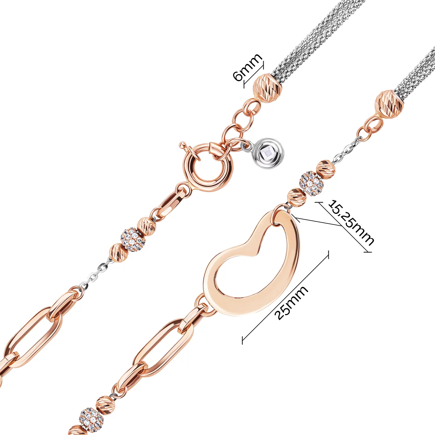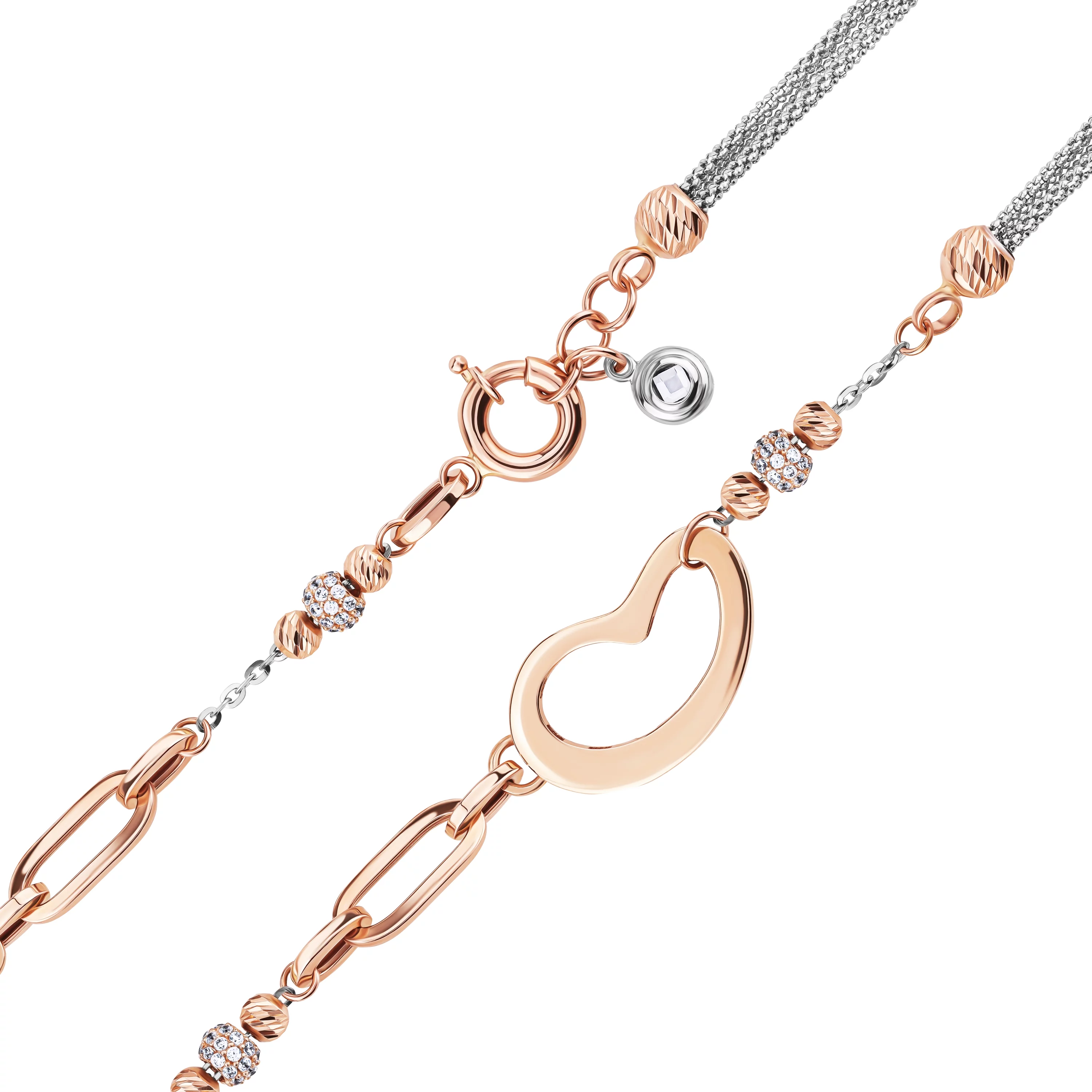 Браслет з червоного золота з підвіскою "Серце" та фіанітами плетіння якірне та шопард - 1641131