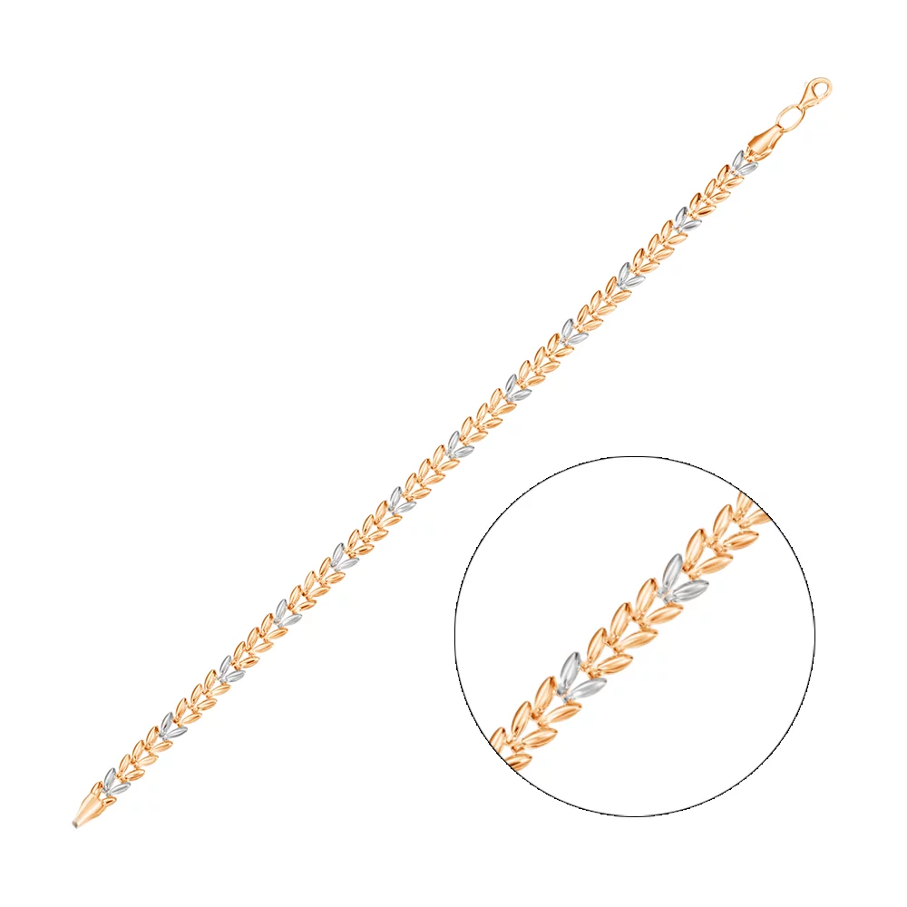 Браслет з комбінованого золота - вишукана прикраса, яка гармонійно доповнить як урочистий, так і повсякденний образ. Створений із золота 585-ї проби, він має стильний дизайн і оригінальне плетіння, яке привертає увагу своєю витонченою фактурою. Розкішний блиск дорогоцінного металу сліпуче грає в променях світла, підкреслюючи елегантність прикраси. Цей універсальний аксесуар легко поєднується з іншими ювелірними виробами, а міцний замок гарантує надійну фіксацію навіть для масивних моделей. В інтернет-магазині AURUM jewelry на вас чекають найкращі ціни на ювелірні прикраси. Оформіть замовлення та додайте до своєї колекції браслет, який підкреслить ваш стиль!